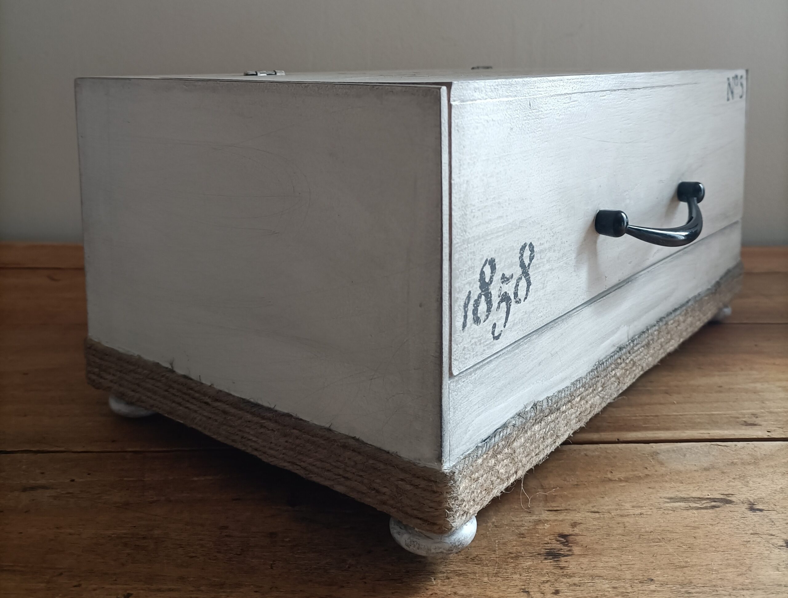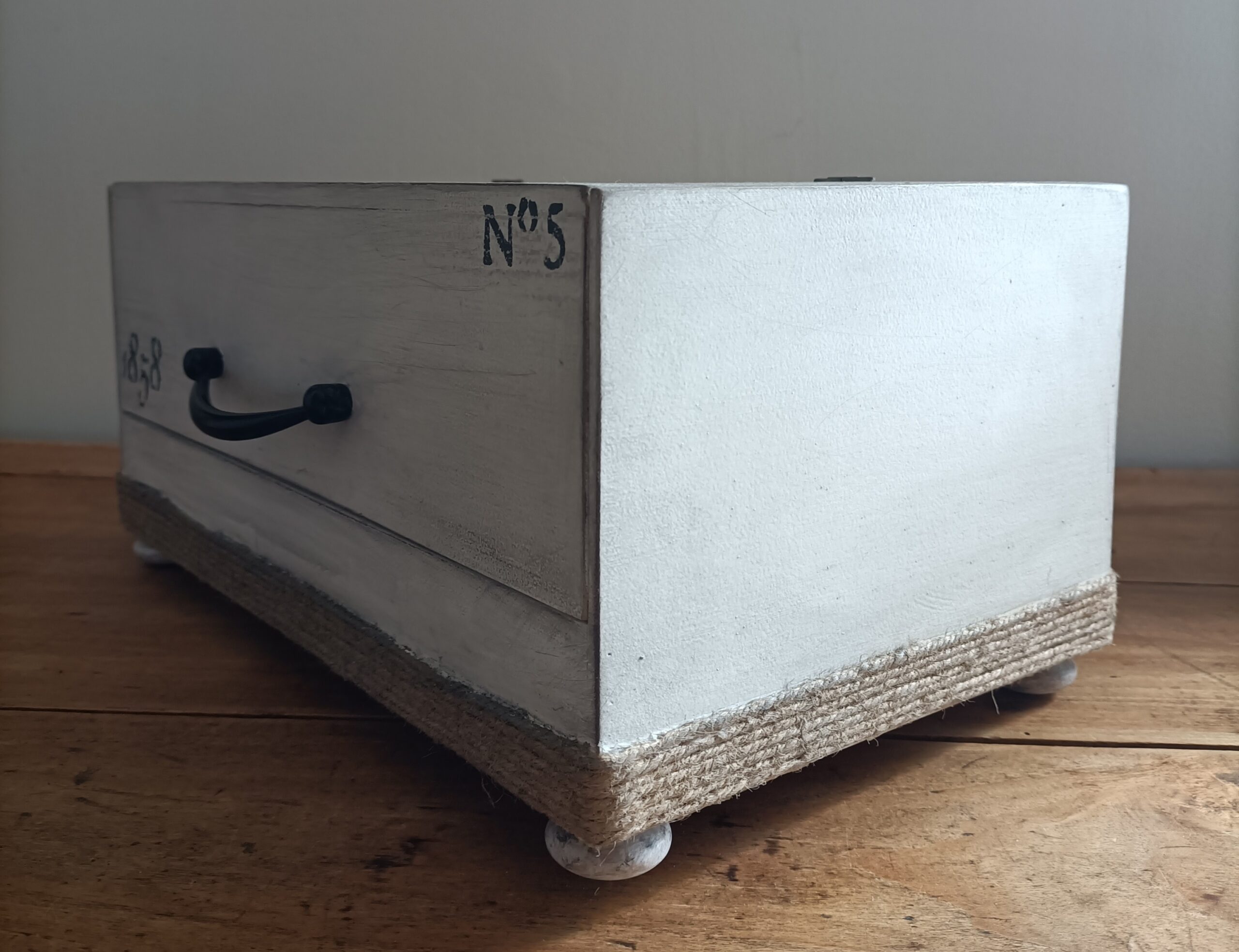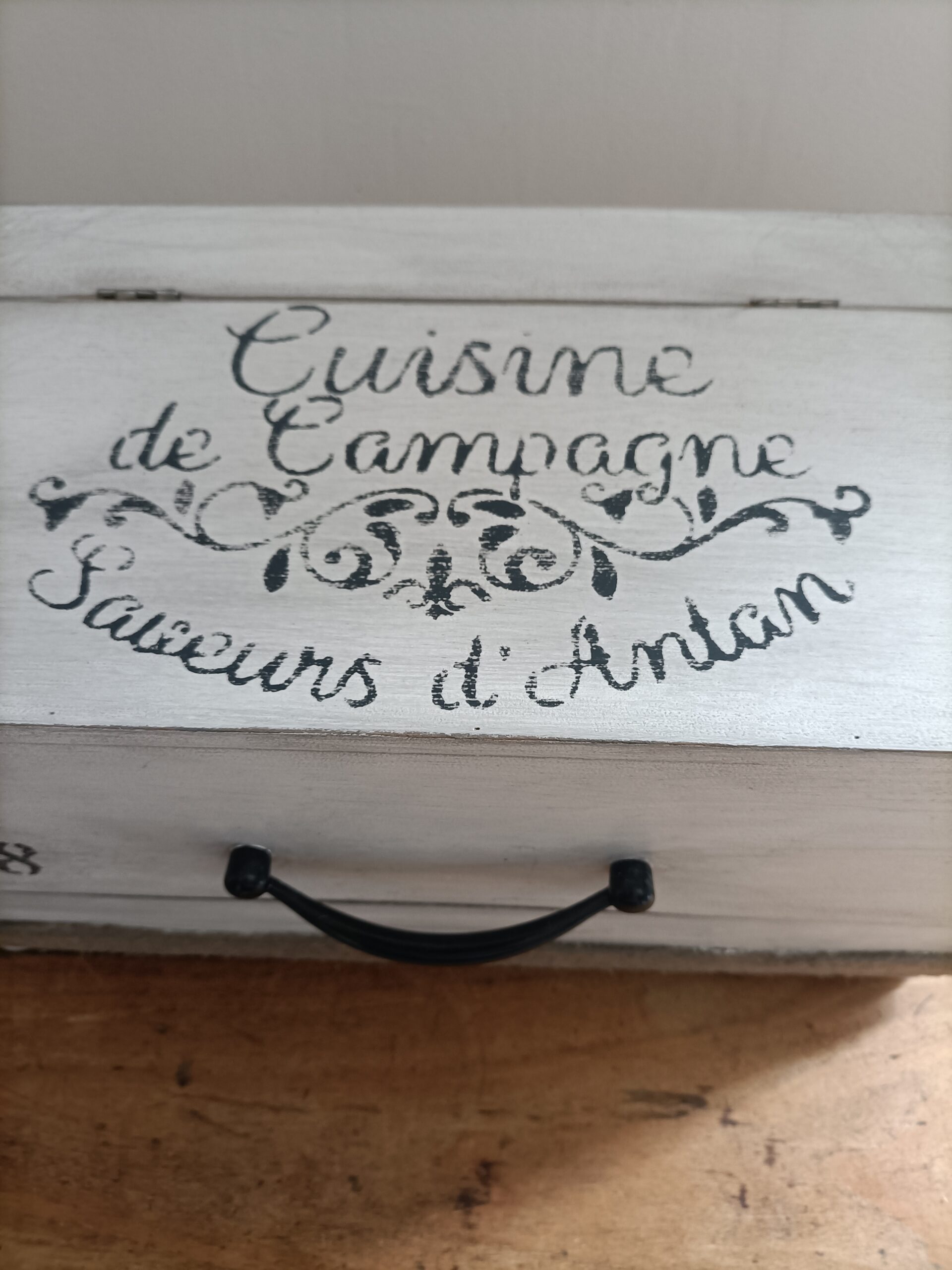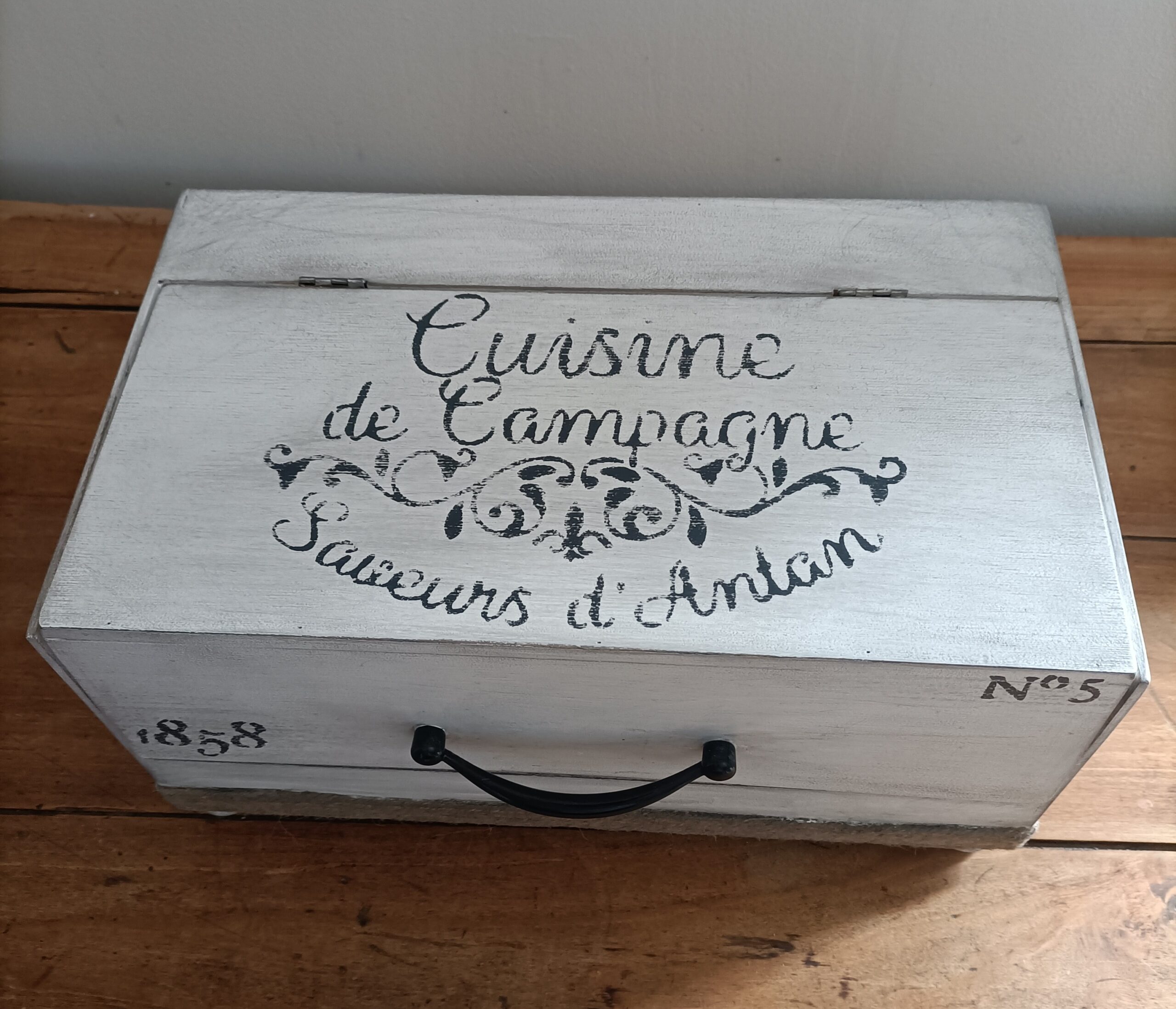 Elle a été repeinte en blanc à l’extérieur, puis effet vieilli avec de la peinture noire, l’intérieur de la boite est resté brut pour un stockage d’aliment et réhaussé de quatre petits pieds pour plus de présence. Nous l’avons décorée avec des pochoirs vintage noir et remplacé la poignée bois par une poignée en métal noir pour un style un peu plus industriel.