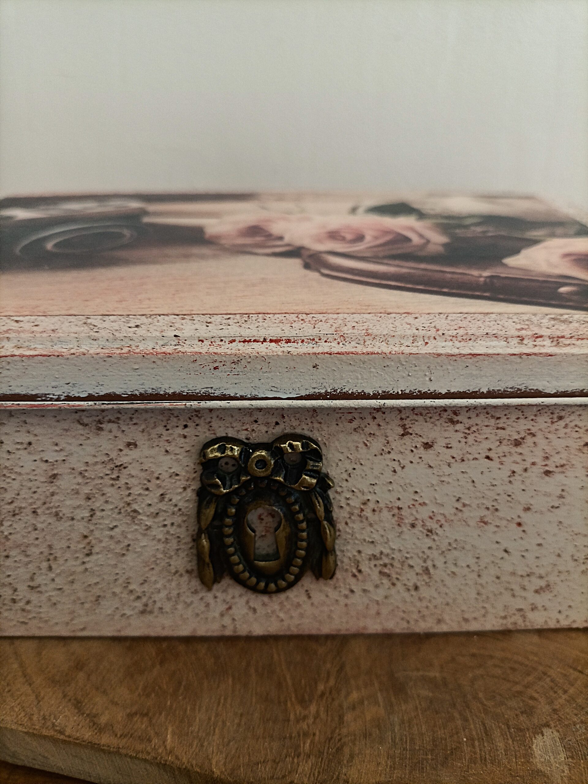 Cette boite de rangement rénovée est une véritable pièce unique de caractère, mêlant esthétique vintage et fonctionnalité. Restaurée avec soin, elle arbore une peinture vieillie, réhaussée par un visuel rétro représentant un appareil photo associé à ces roses.