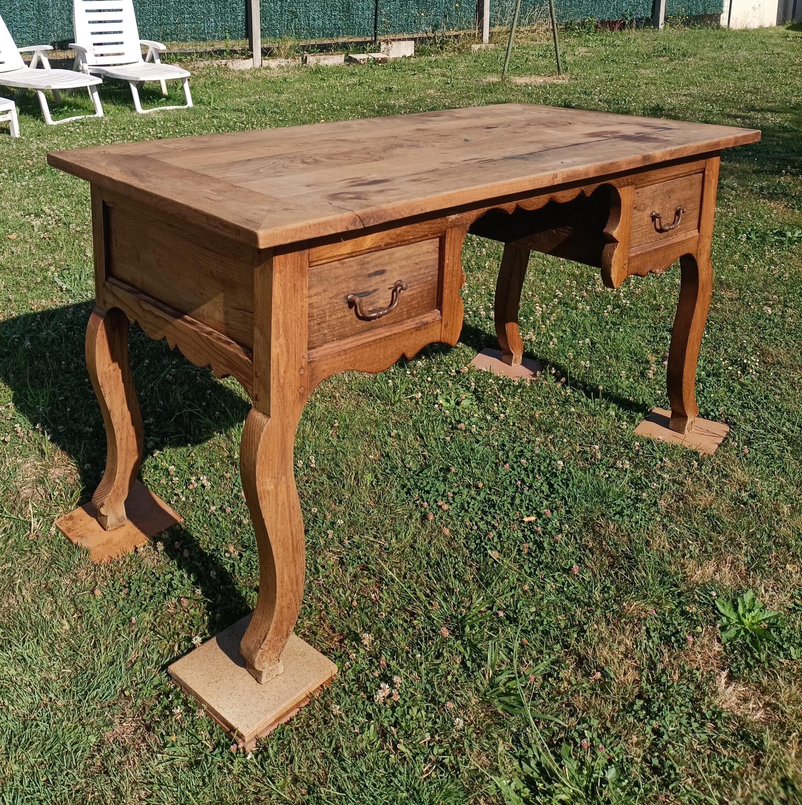 Bureau inspiré du mobilier Louis XV, ce type de bureau a été produit dans les années 1930 à 1970 dans des ateliers d’ébénisterie régionaux, souvent dans le cadre de meubles de famille ou de mariage. Un style intemporel mêlant charme ancien et praticité moderne.