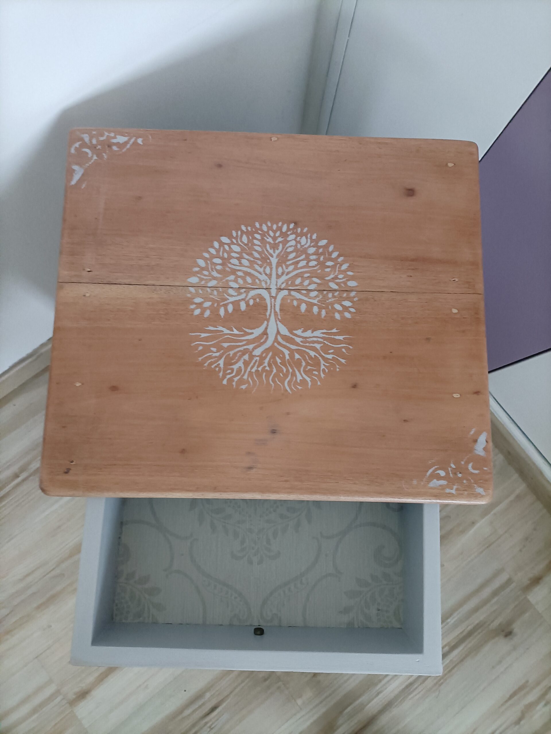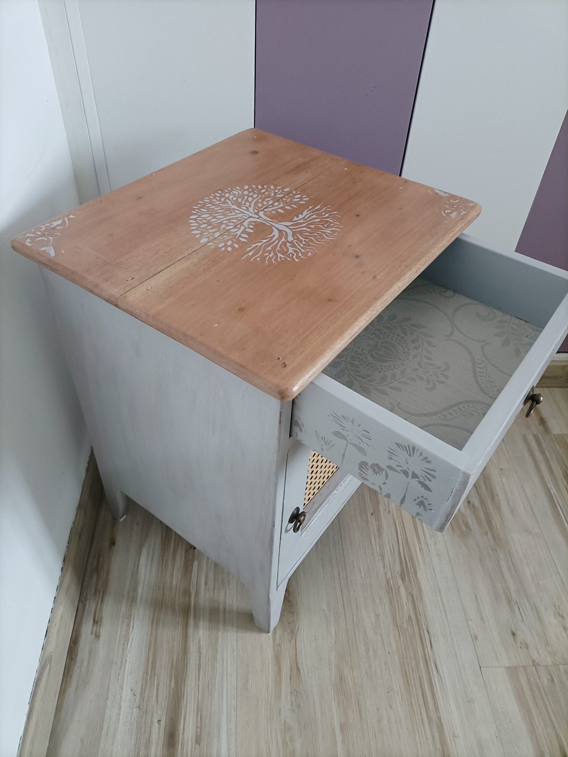 Il a été soigneusement nettoyé, poncé, traité au xylophène, puis recouvert d’une peinture couleur gris souri. Son plateau a été juste protégé d’un vernis légèrement teinté naturel, vieilli après lui avoir apposé un pochoir « l’arbre de vie ». Il se compose d’un tiroir et d’une porte relookée par un cannage.