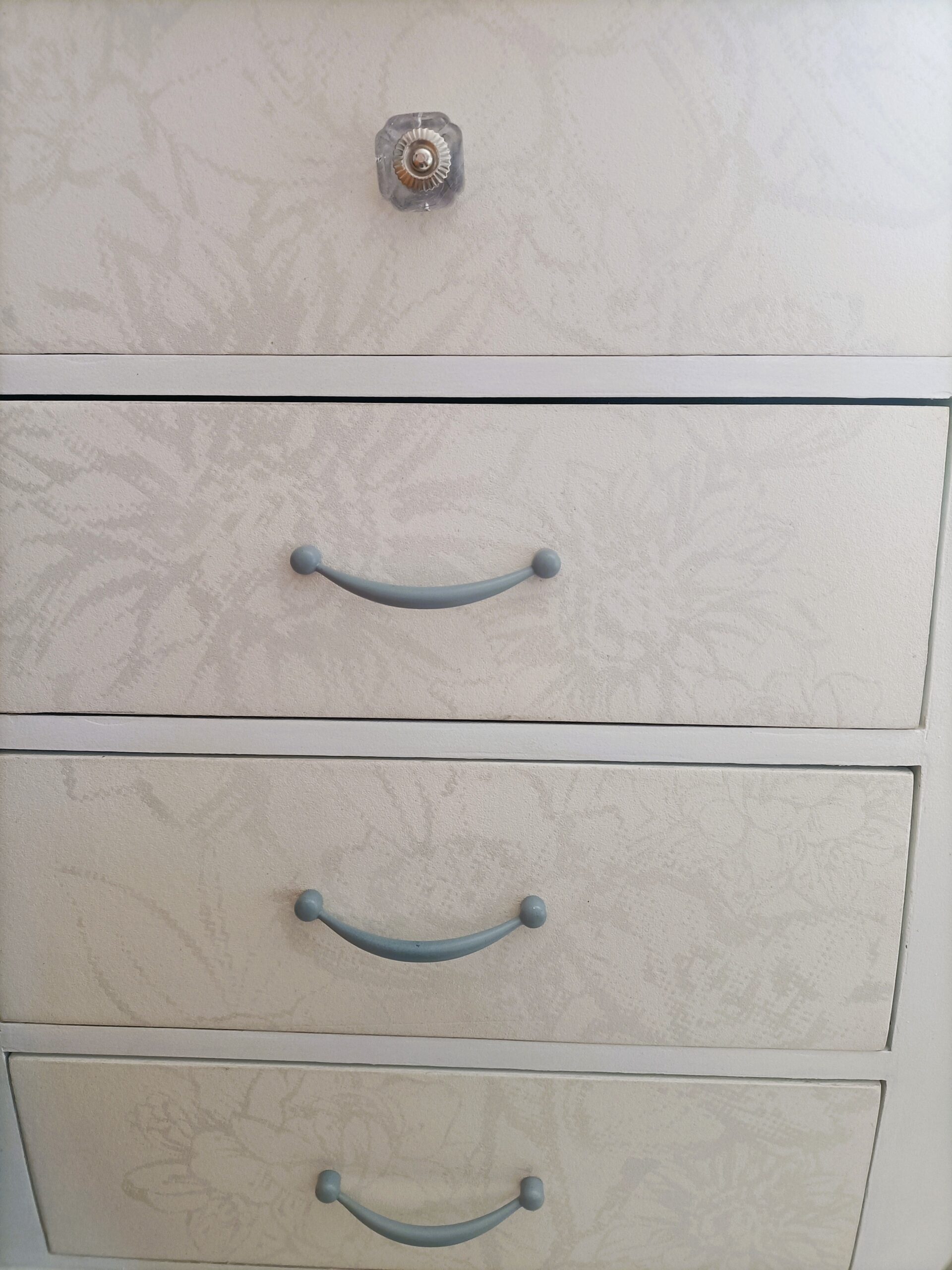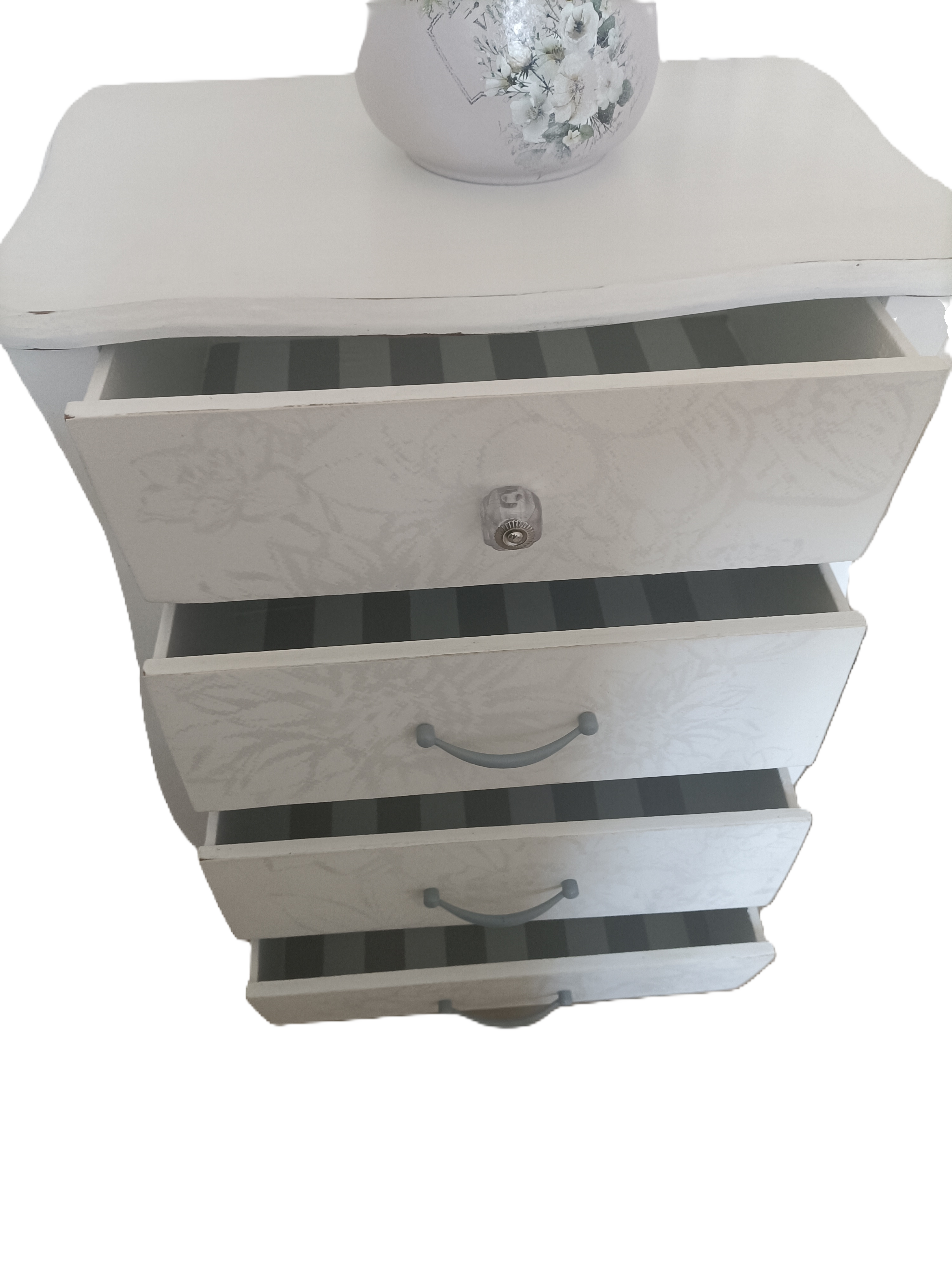 Doté de 4 tiroirs recouvert d’un papier peint intissé lessivable aux motifs fleuris doux et discret. Ils sont assez grands pour un rangement discret de vos vêtements, vaisselles, photos, papiers ou autres accessoires.