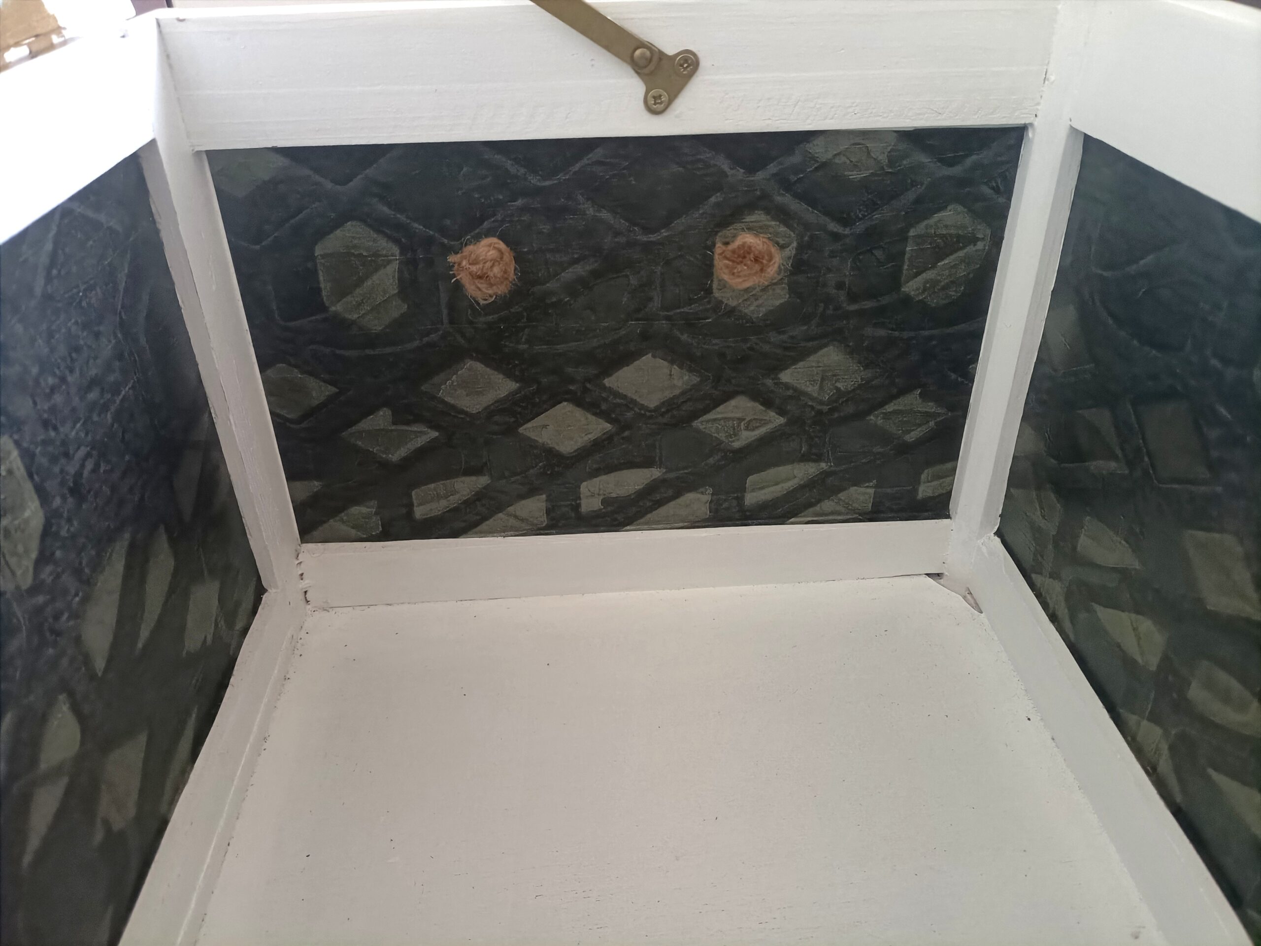 A l’intérieur, nous avons prit soin de couvrir les 4 cotés d’un papier peint noir et or qui a été verni pour le protéger. Les coins et le couvercle sont de la même peinture que l’extérieur.