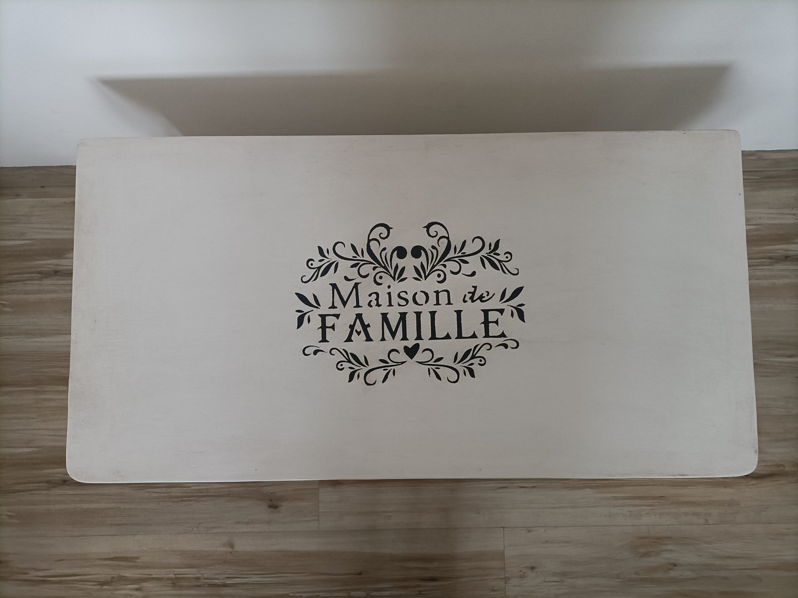 • Pochoirs décoratifs vintage fixée sur le couvercle et le devant et protégée par une cire incolore.