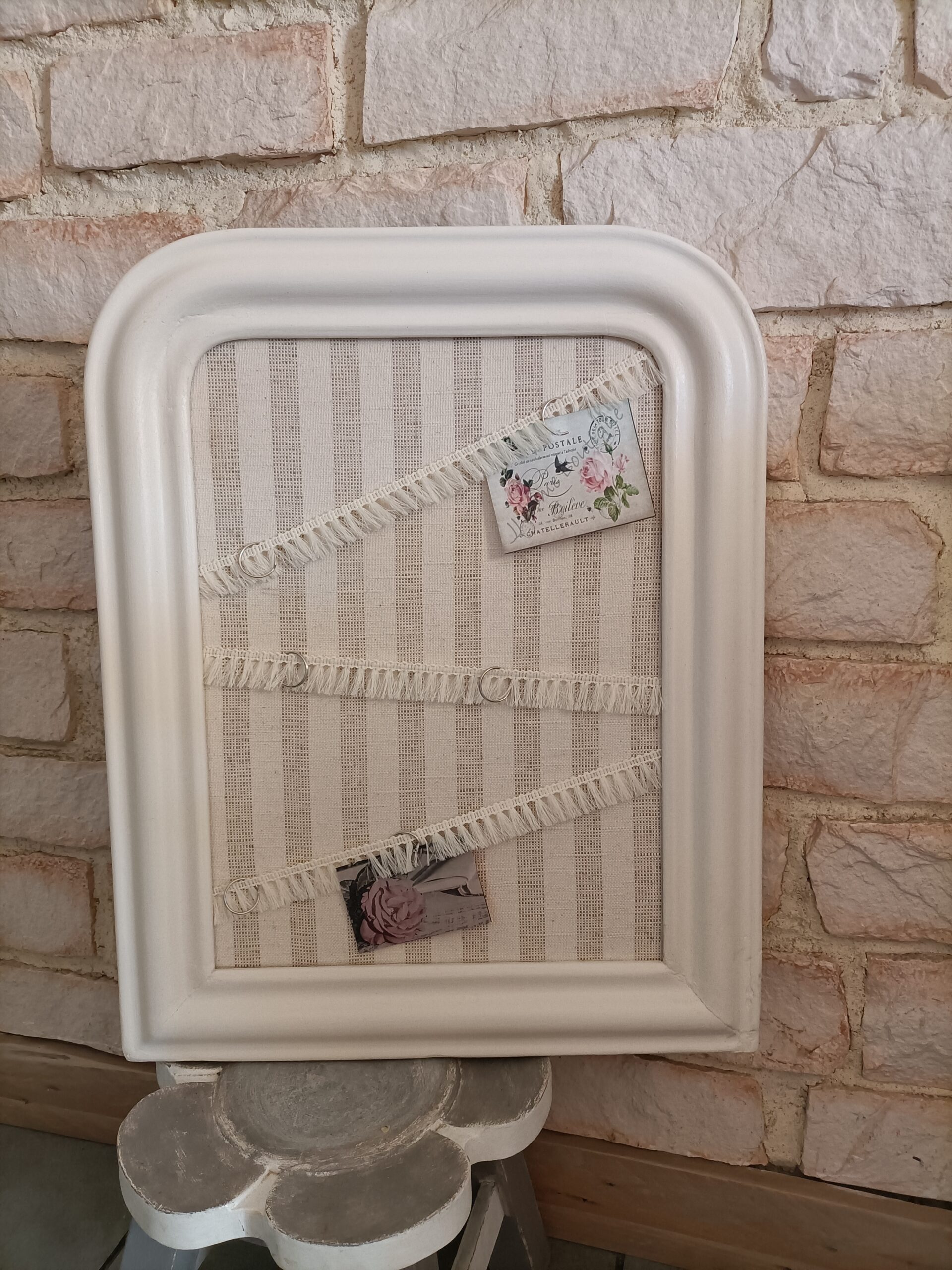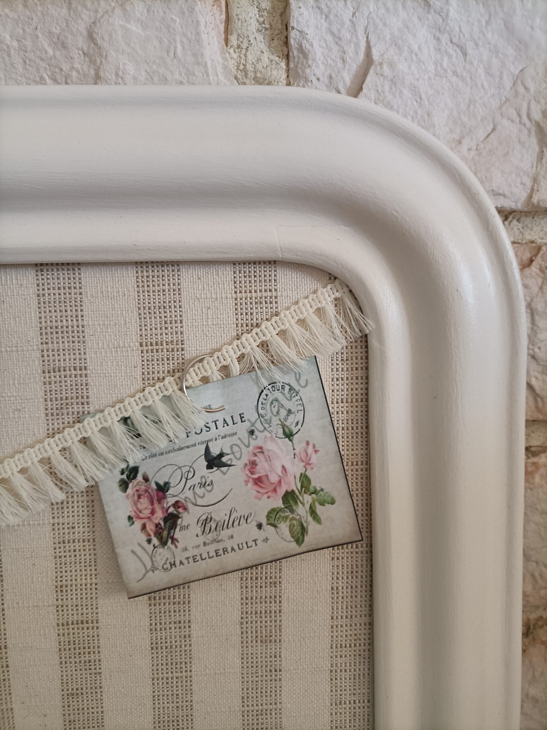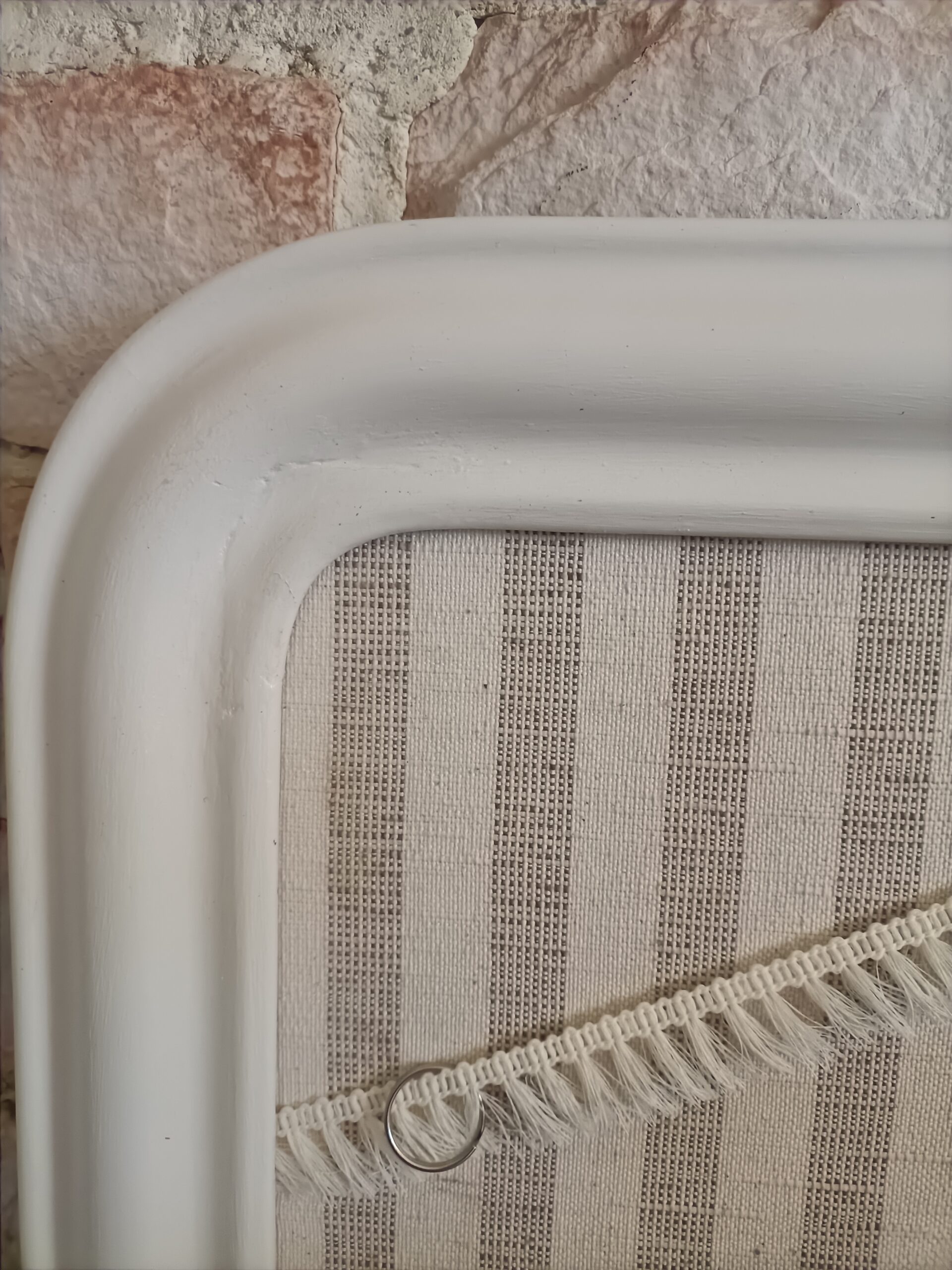 Le miroir : Ancien cadre bombé en bois peint à la main (couleur parchemin), finition d’un vernis de protection. Le fond est recouvert d’un tissus couleur lin habillé d’un galon blanc cassé.
