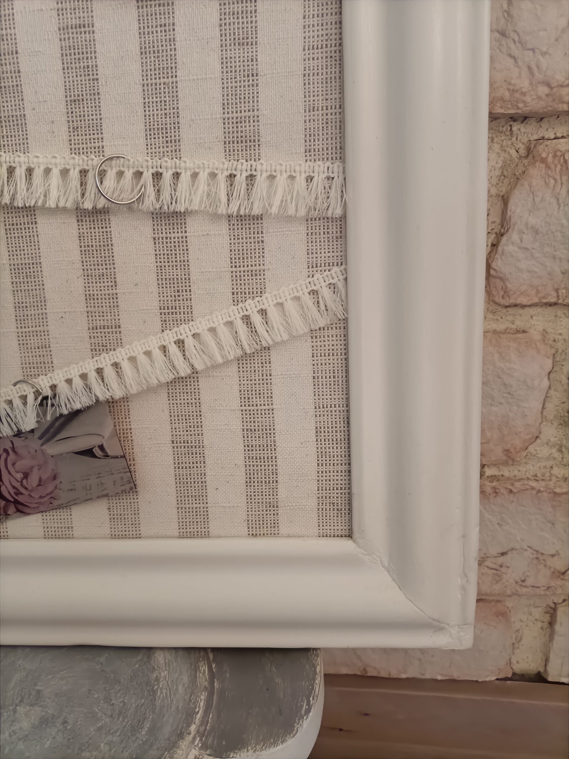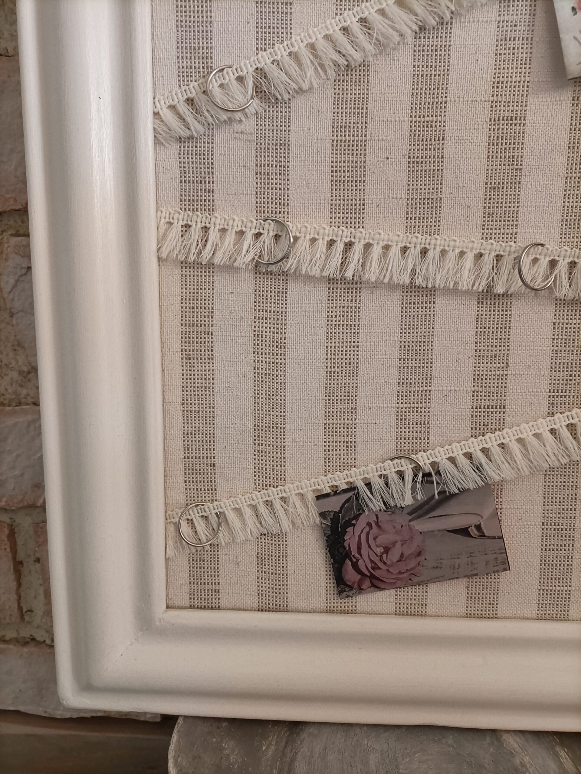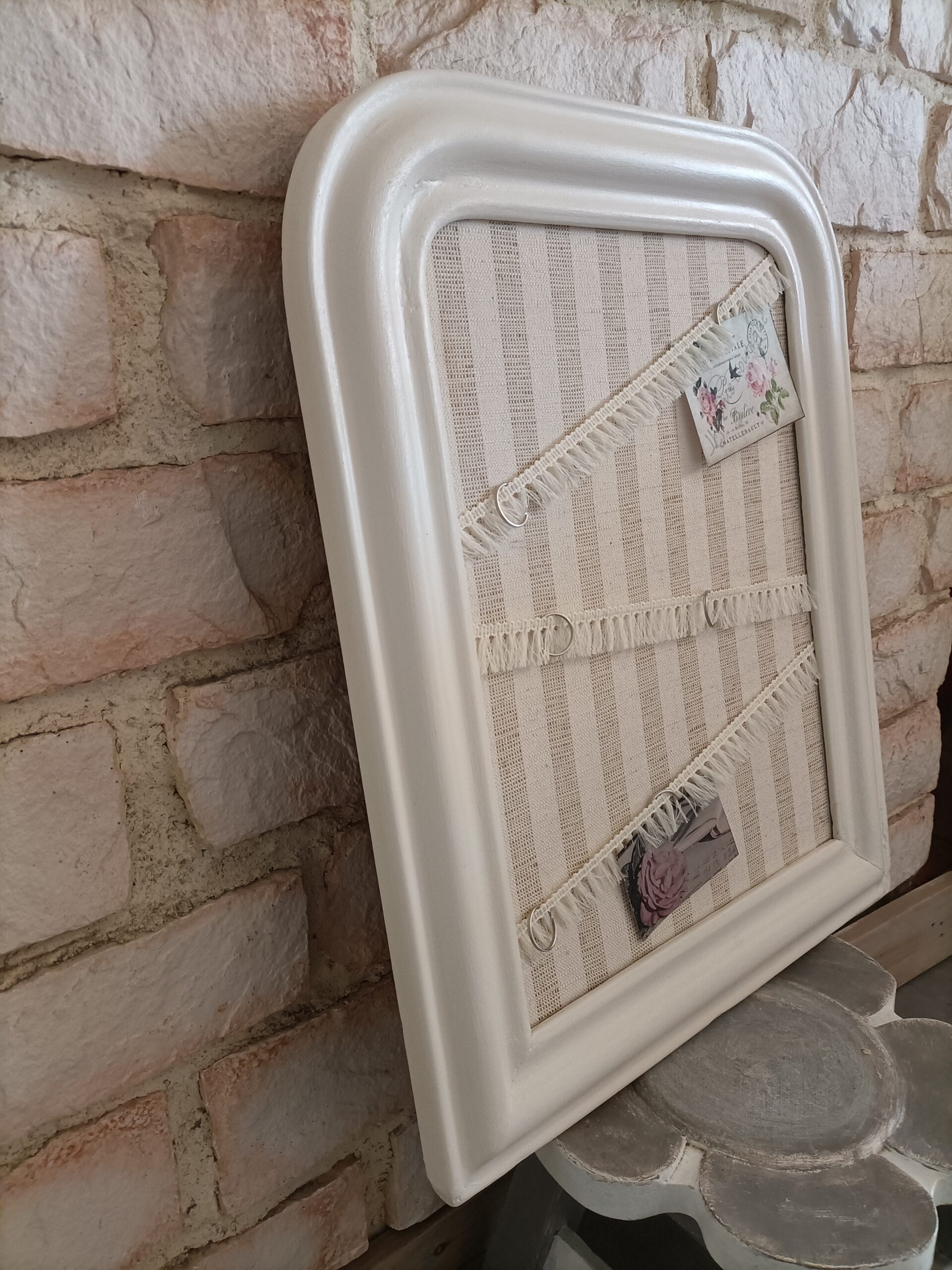 Le miroir : Ancien cadre bombé en bois peint à la main (couleur parchemin), finition d’un vernis de protection. Le fond est recouvert d’un tissus couleur lin habillé d’un galon blanc cassé.