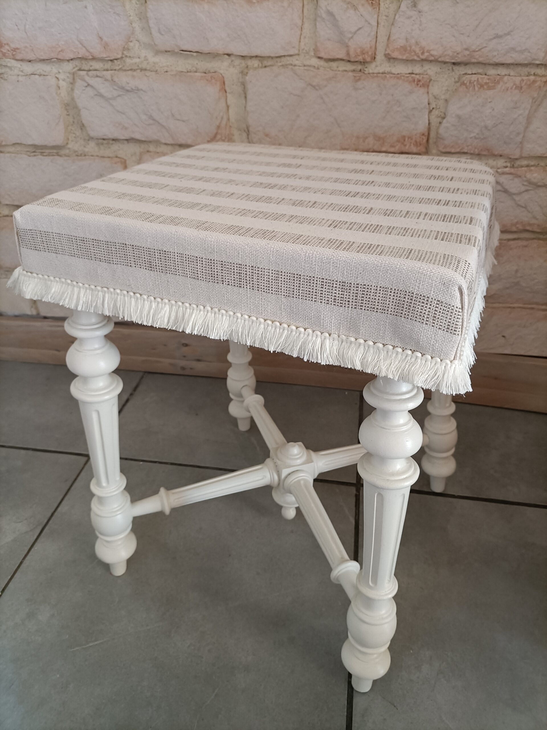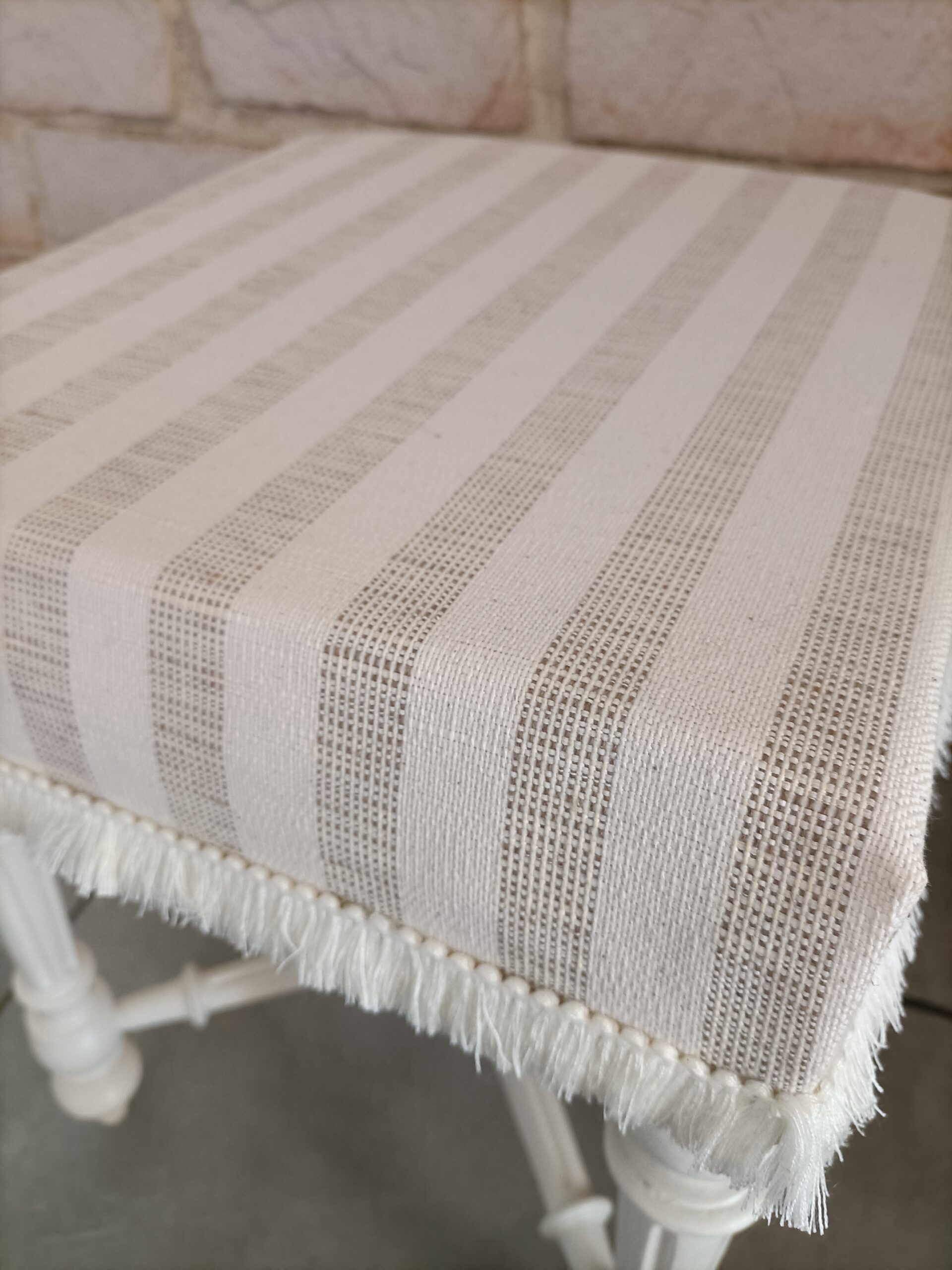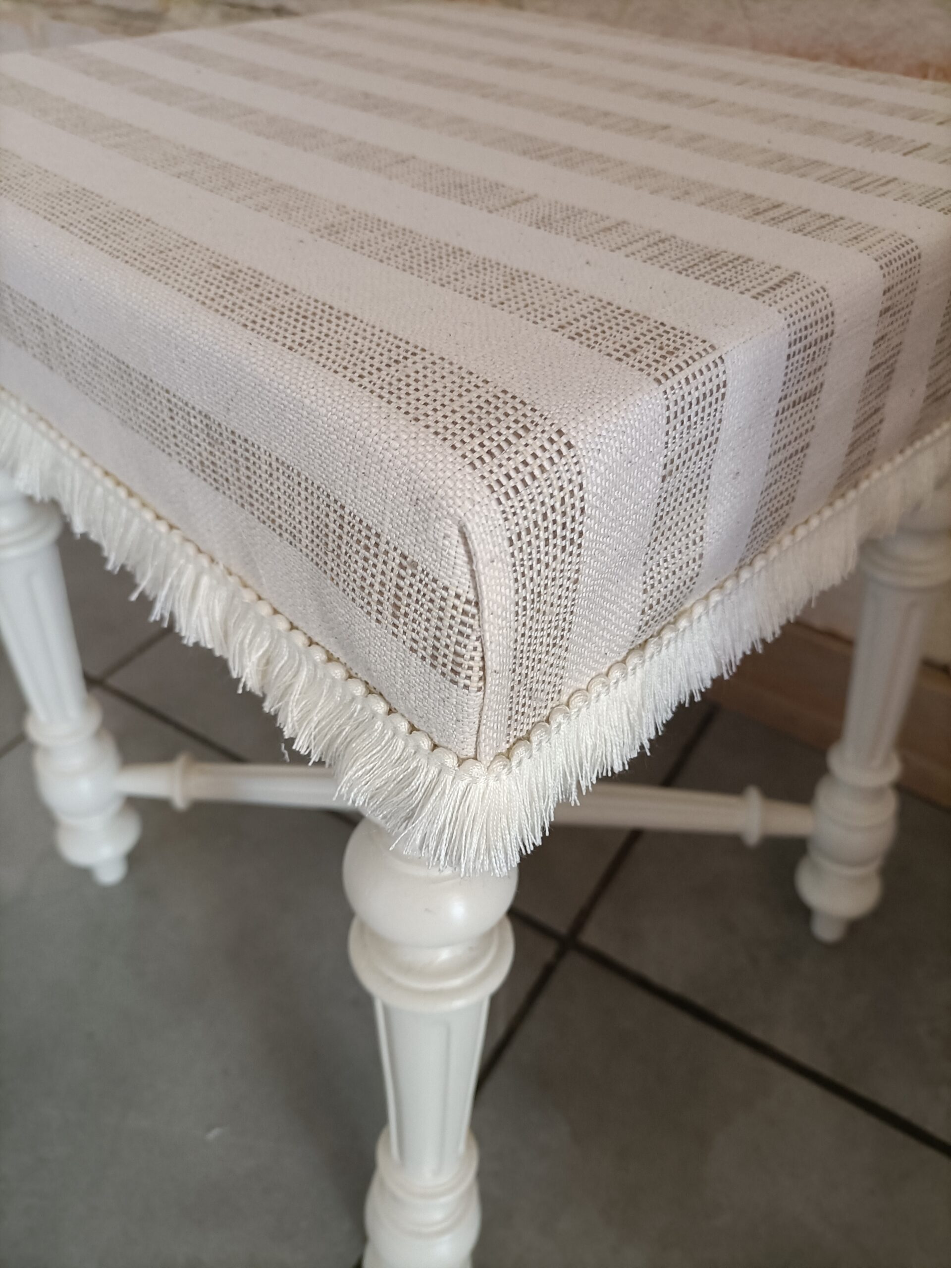 Le tabouret pour coiffeuse : Pieds tournés relookés à la même peinture que le mémo (couleur parchemin), finition d’un vernis de protection. L’assise à été totalement refaite avec de gros tasseaux pour le cadre, puis une mousse recouverte du film de coton suivi d’un tissus couleur lin à rayures assorti au Mémo pour un confort optimal, bordure à franges blanc cassé.