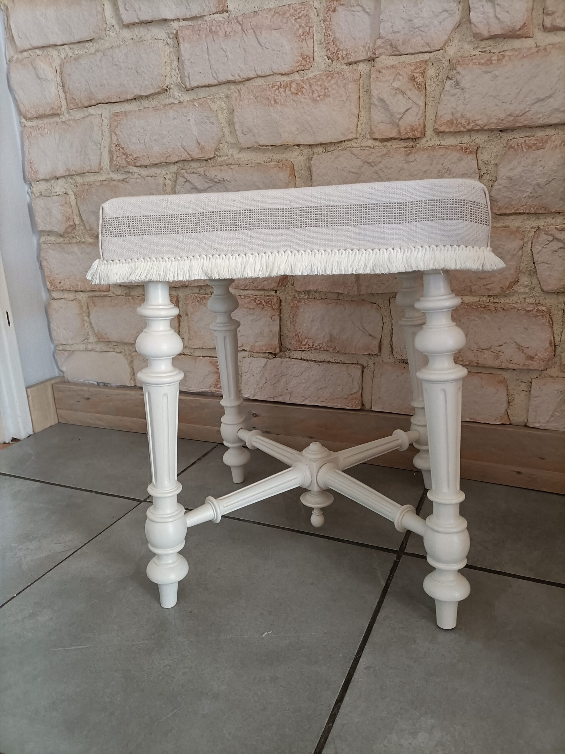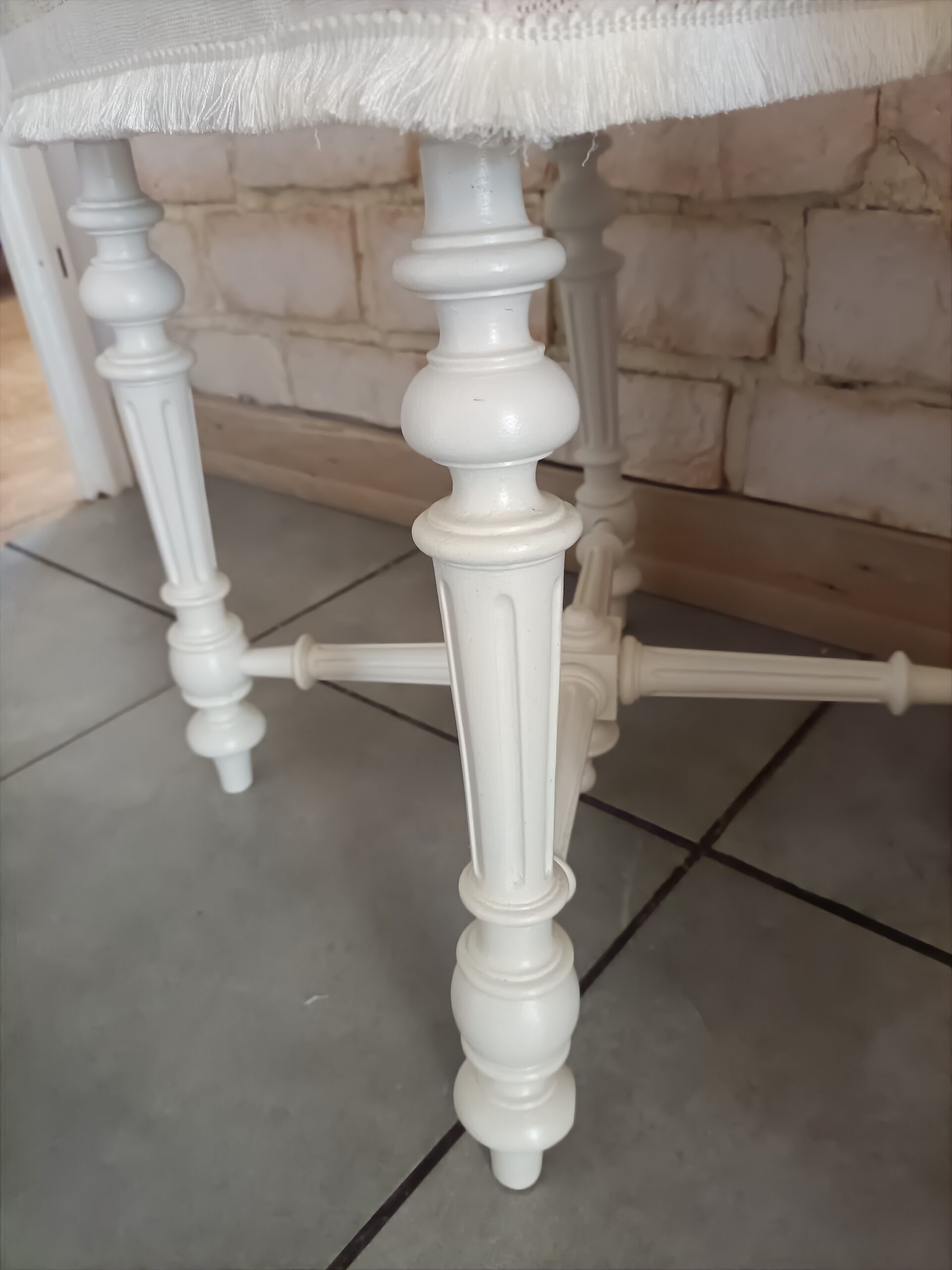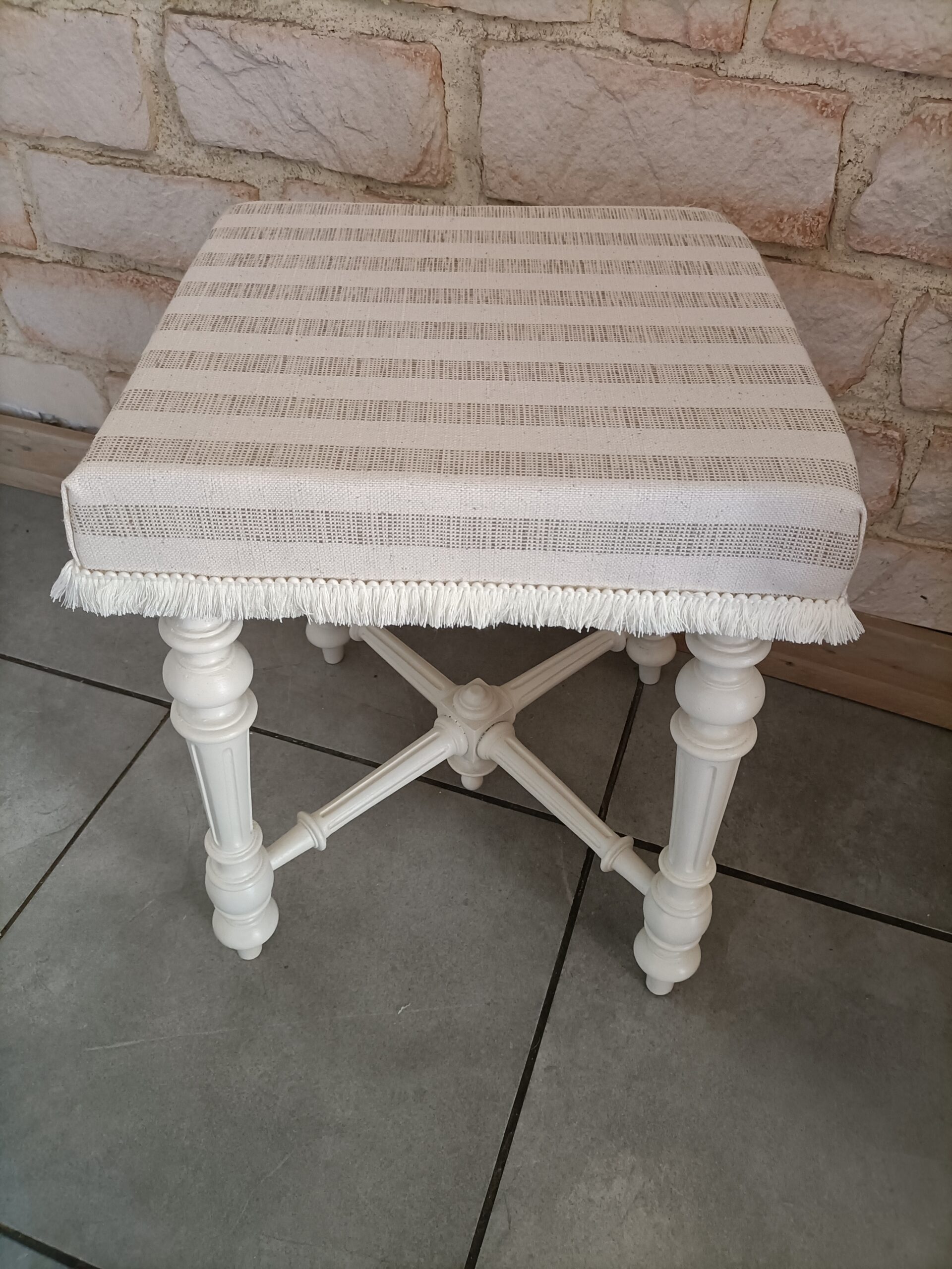 Le tabouret pour coiffeuse : Pieds tournés relookés à la même peinture que le mémo (couleur parchemin), finition d’un vernis de protection. L’assise à été totalement refaite avec de gros tasseaux pour le cadre, puis une mousse recouverte du film de coton suivi d’un tissus couleur lin à rayures assorti au Mémo pour un confort optimal, bordure à franges blanc cassé.