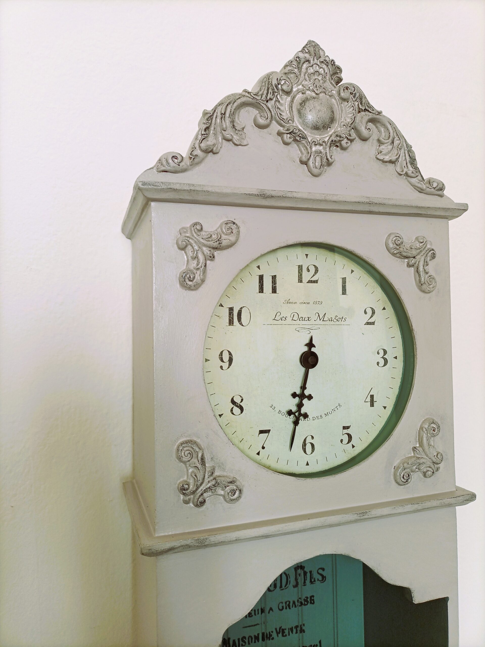 Belle Horloge murale ancienne modernisé aux couleurs taupe et vert kaki cérusé noir sur les moulures et le pochoir que se trouve au centre, protégé par un vernis en 2 couches. Cette horloge authentique fonctionnelle agrémentera votre salon ou chambre ou vous pourrez y exposer vos livres, objets de décorations ou autre accessoires.