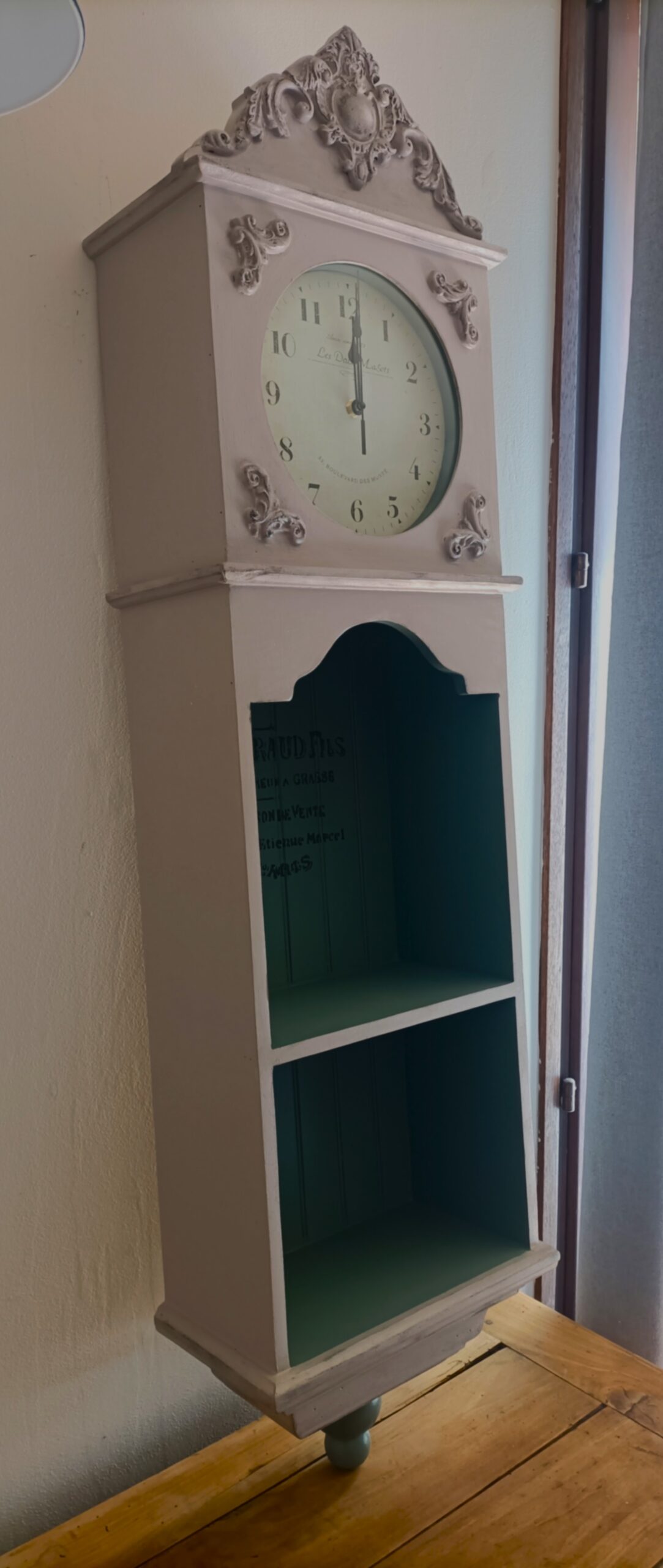 Horloge murale bibliothèque en bois taupe et vert kaki – Style vintage – Réf D250003