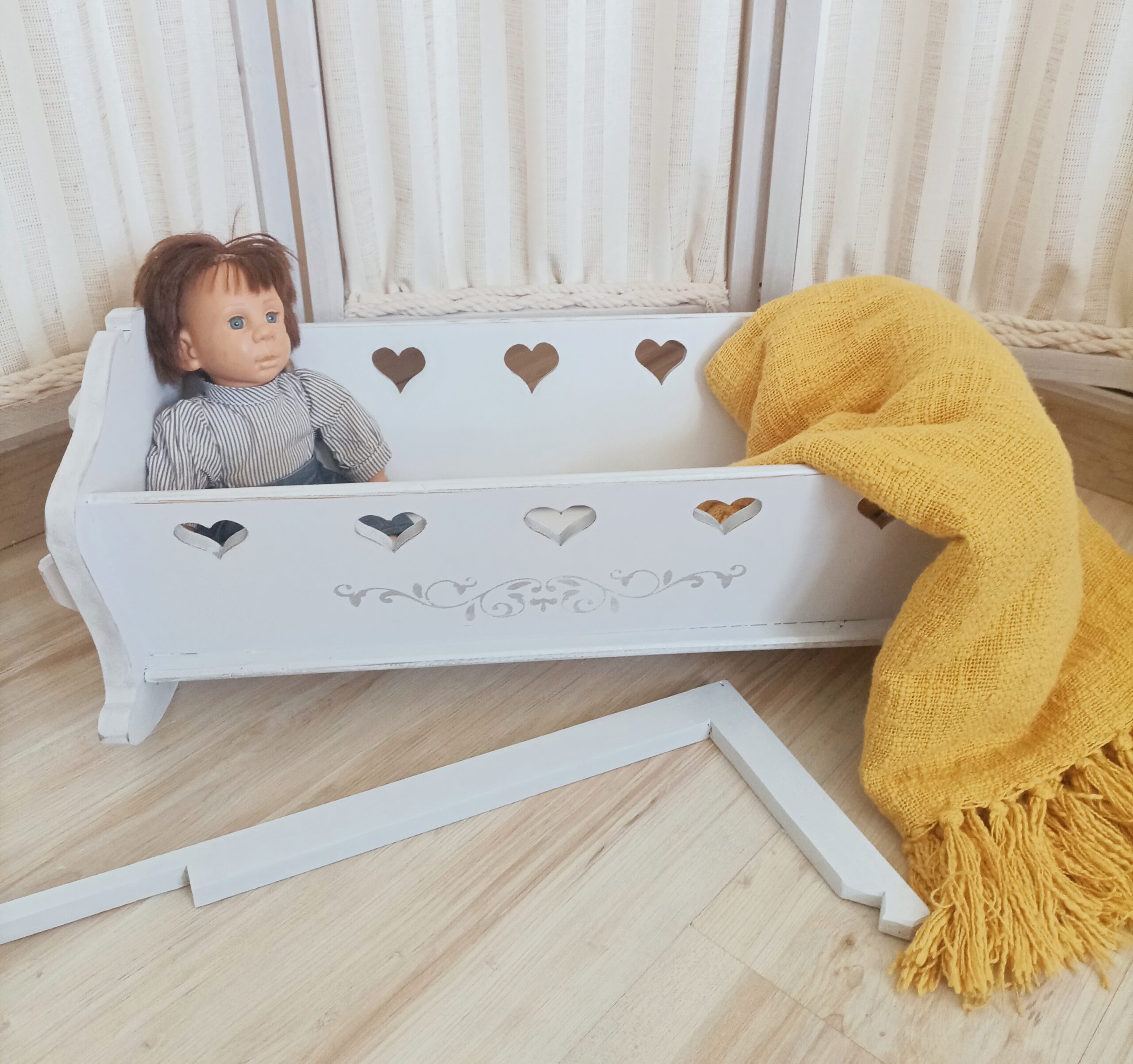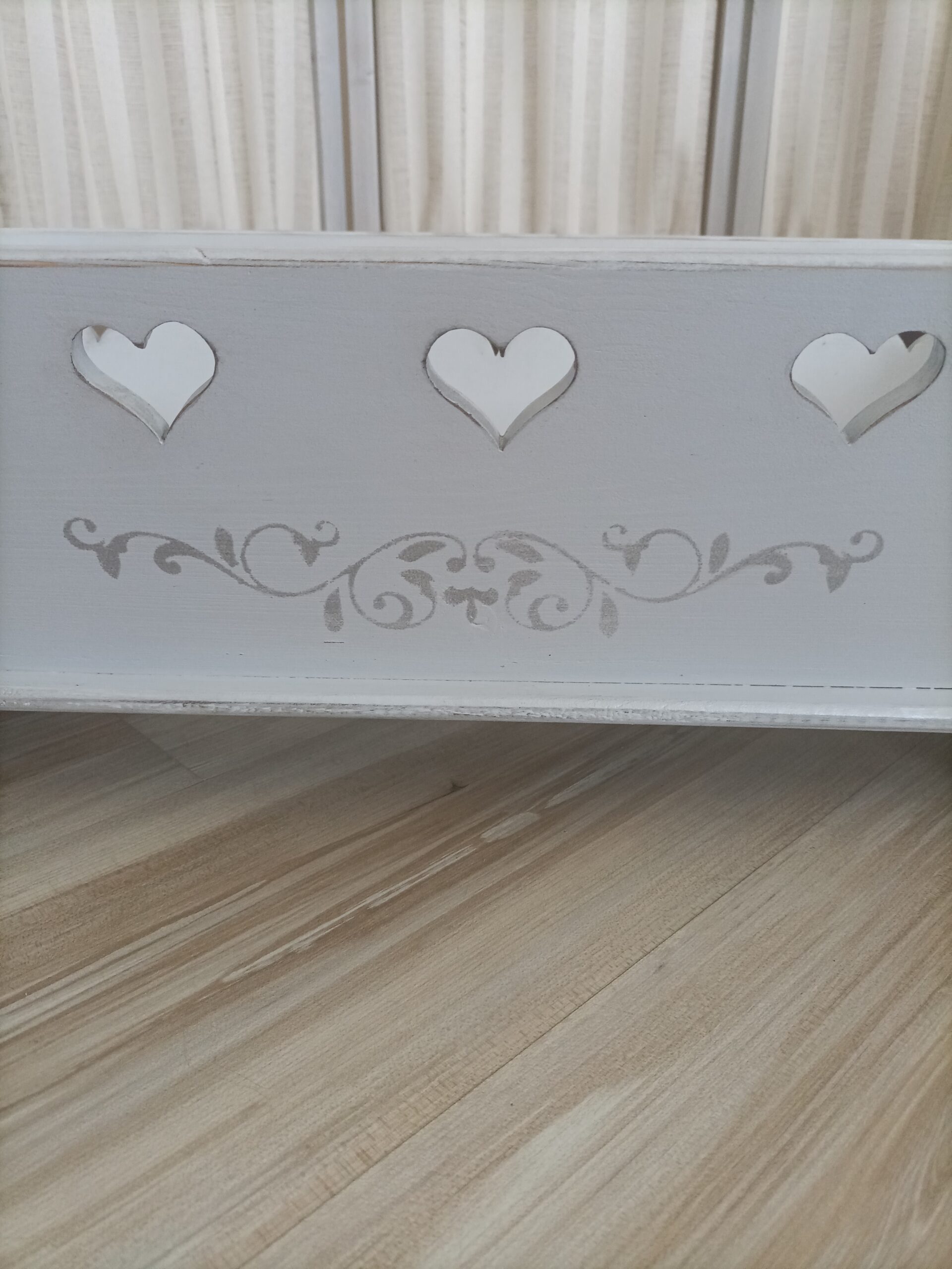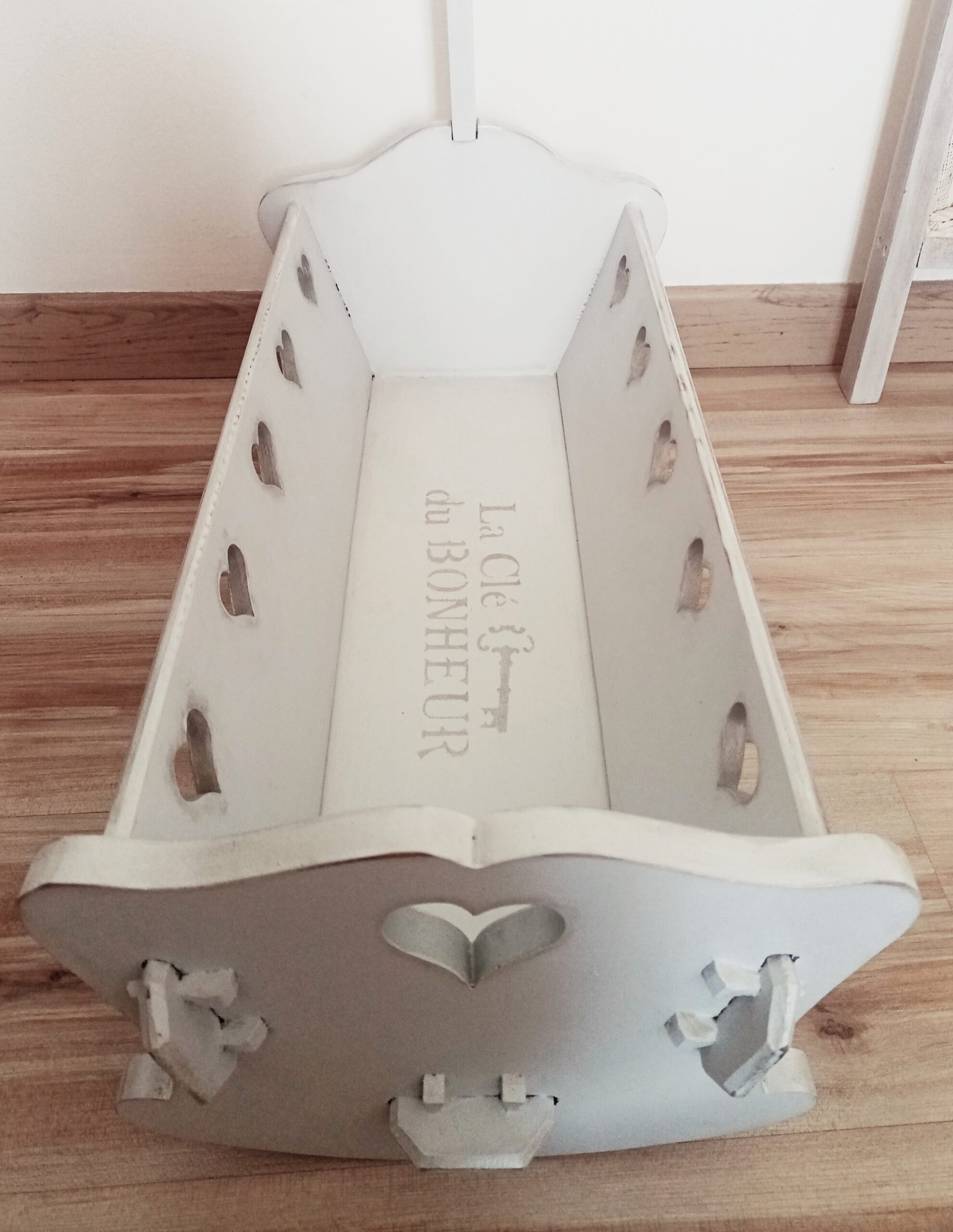 Pour le plus grand plaisir de vos enfants, ancien lit de poupées relooké en peinture gris délicat avec des pochoirs peinture gris argent, décoré de 5 cœurs découpés dans le bois de chaque coté et un plus grand au pied.