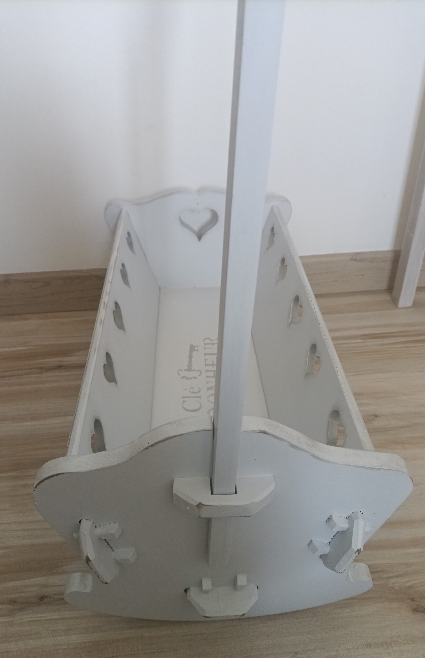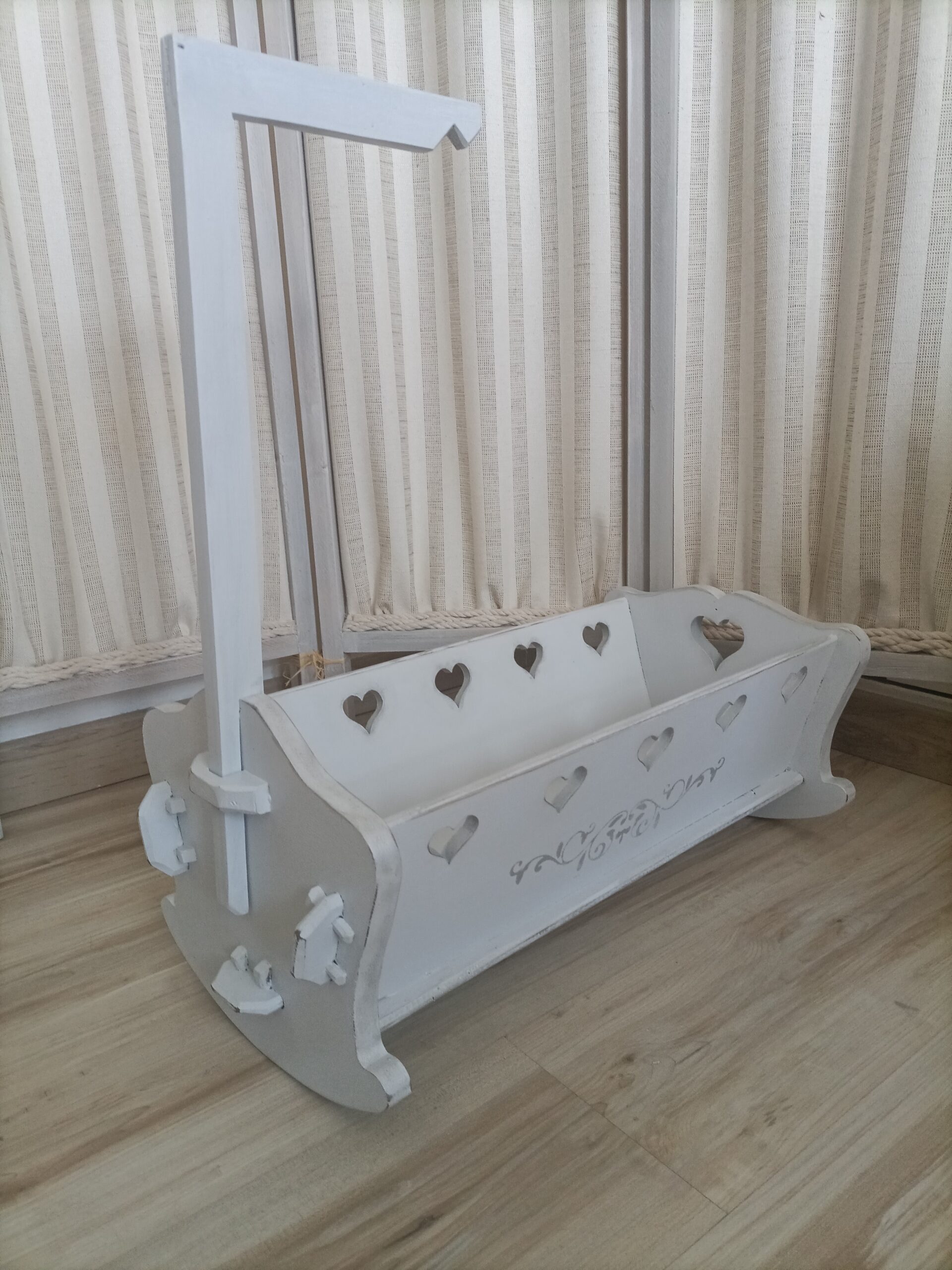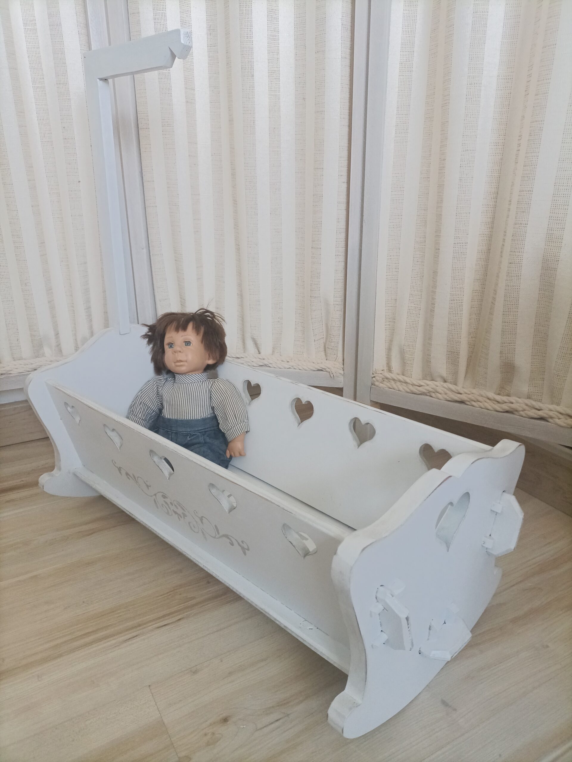 Pour le plus grand plaisir de vos enfants, ancien lit de poupées relooké en peinture gris délicat avec des pochoirs peinture gris argent, décoré de 5 cœurs découpés dans le bois de chaque coté et un plus grand au pied.