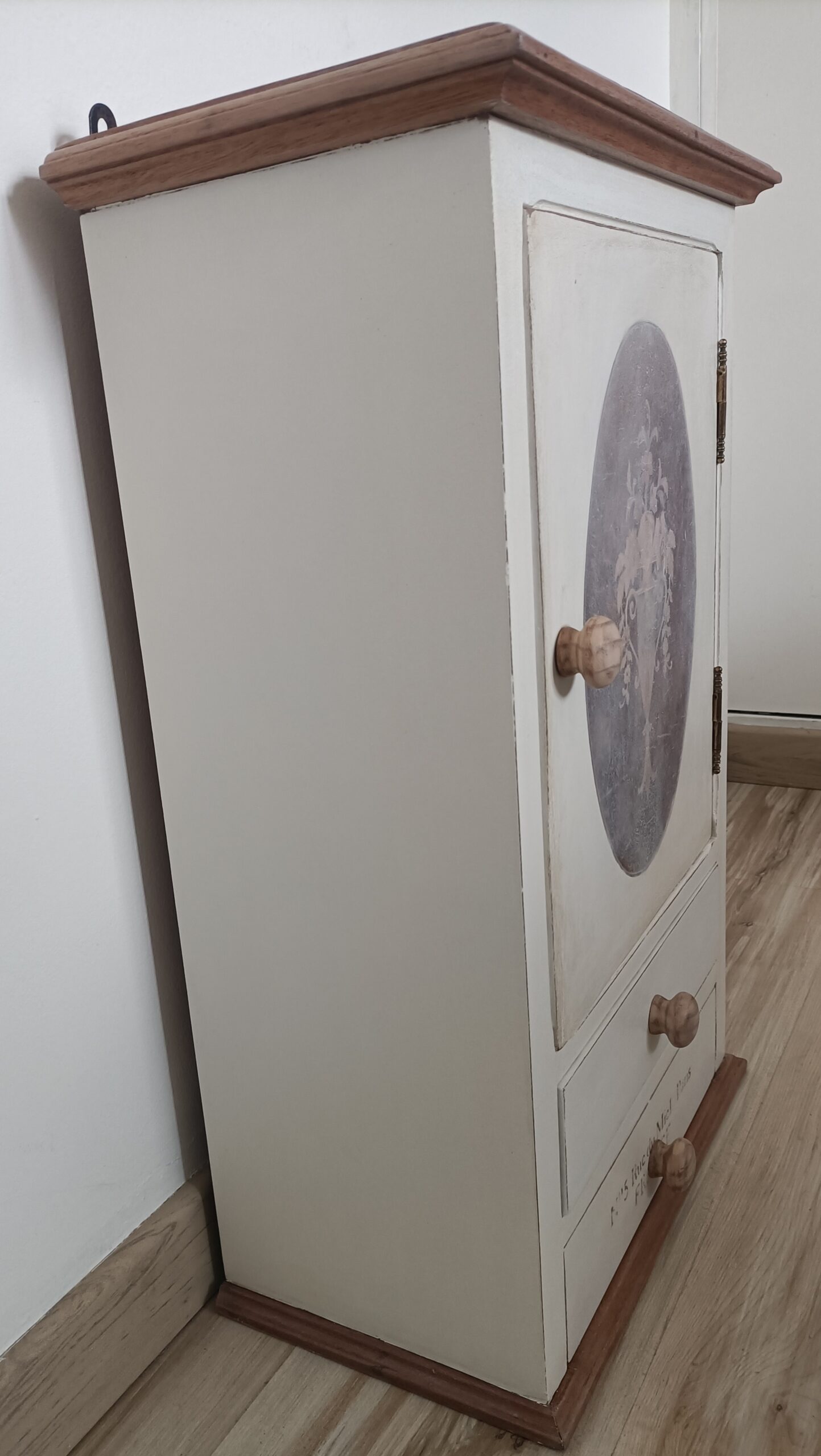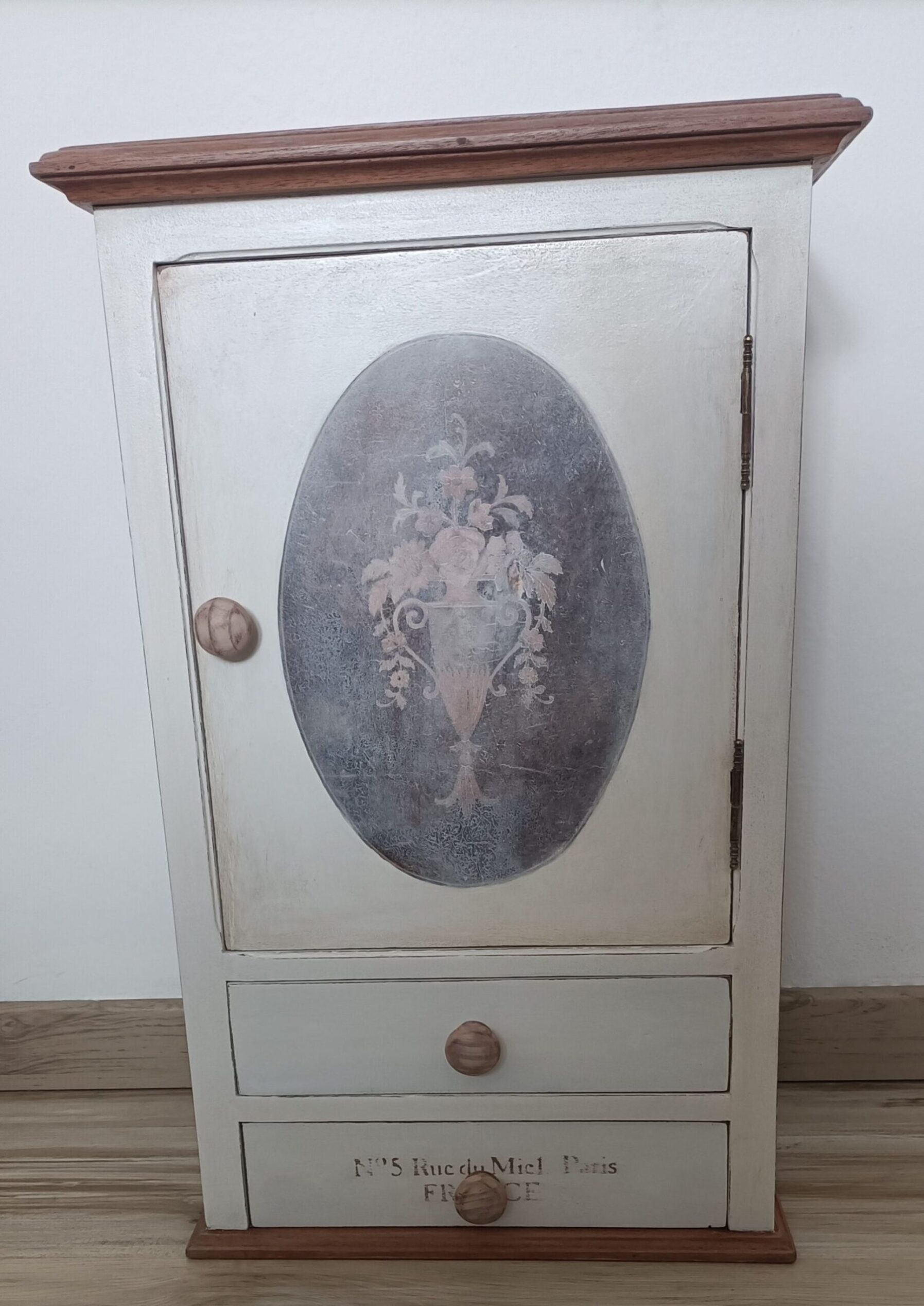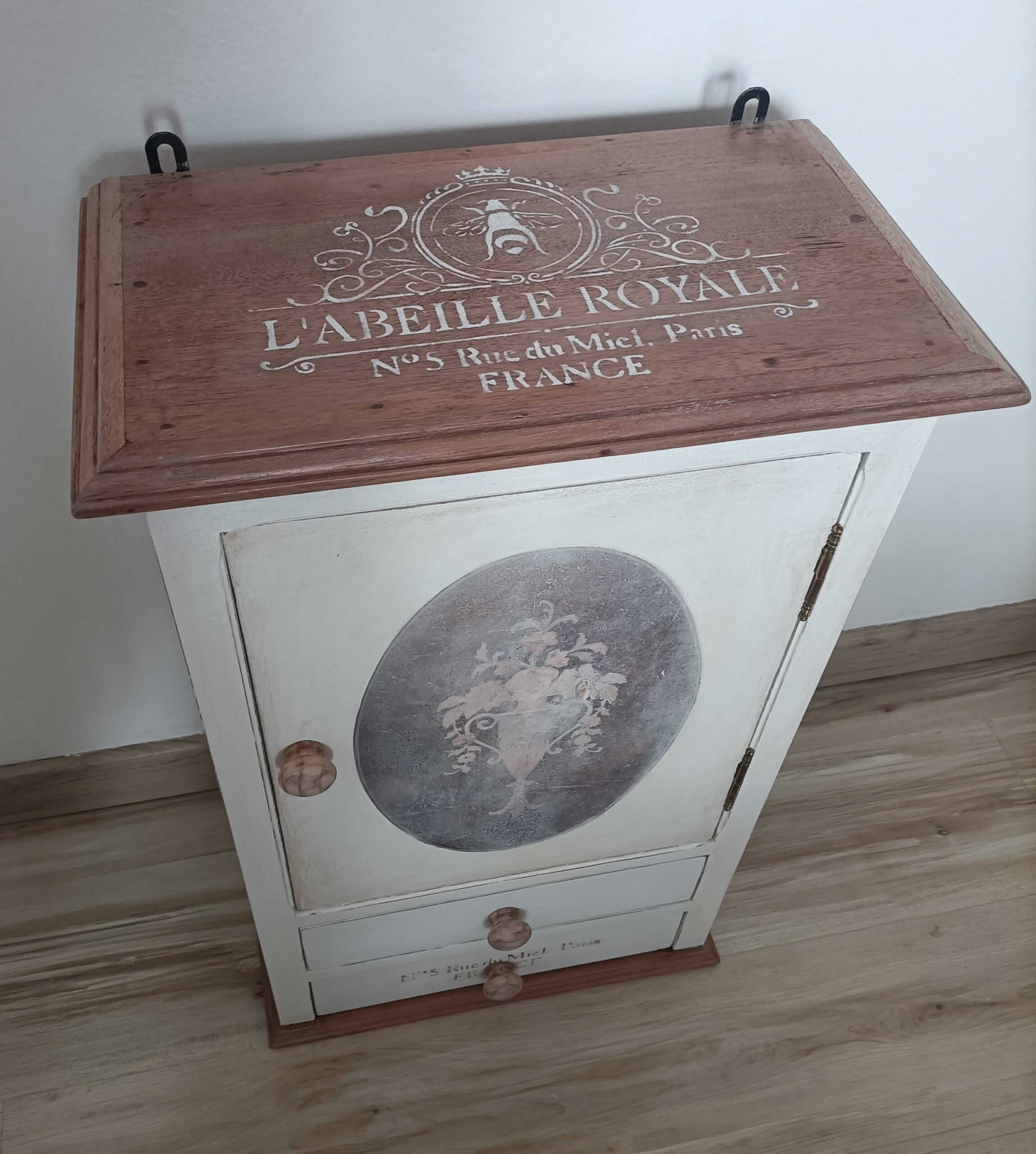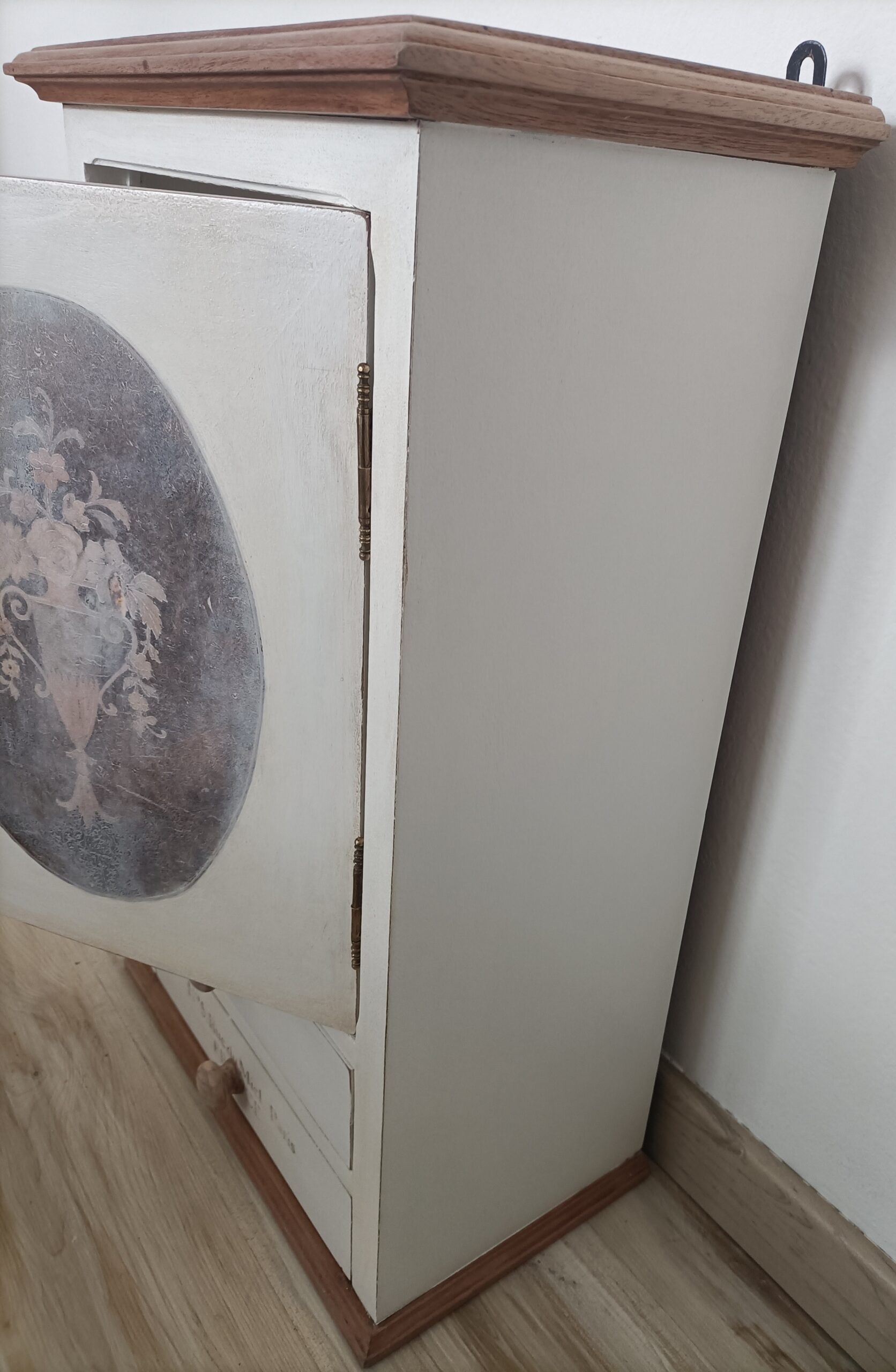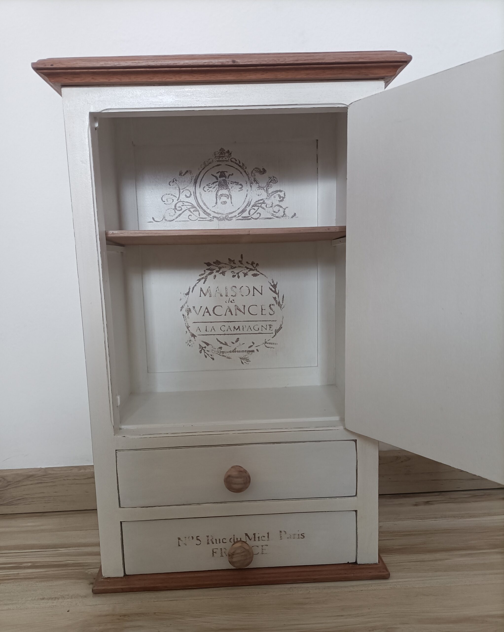 Petit meuble Vintage totalement refait à neuf contenant une porte avec une étagère et deux tiroir, décoré de pochoir intérieur comme extérieur.