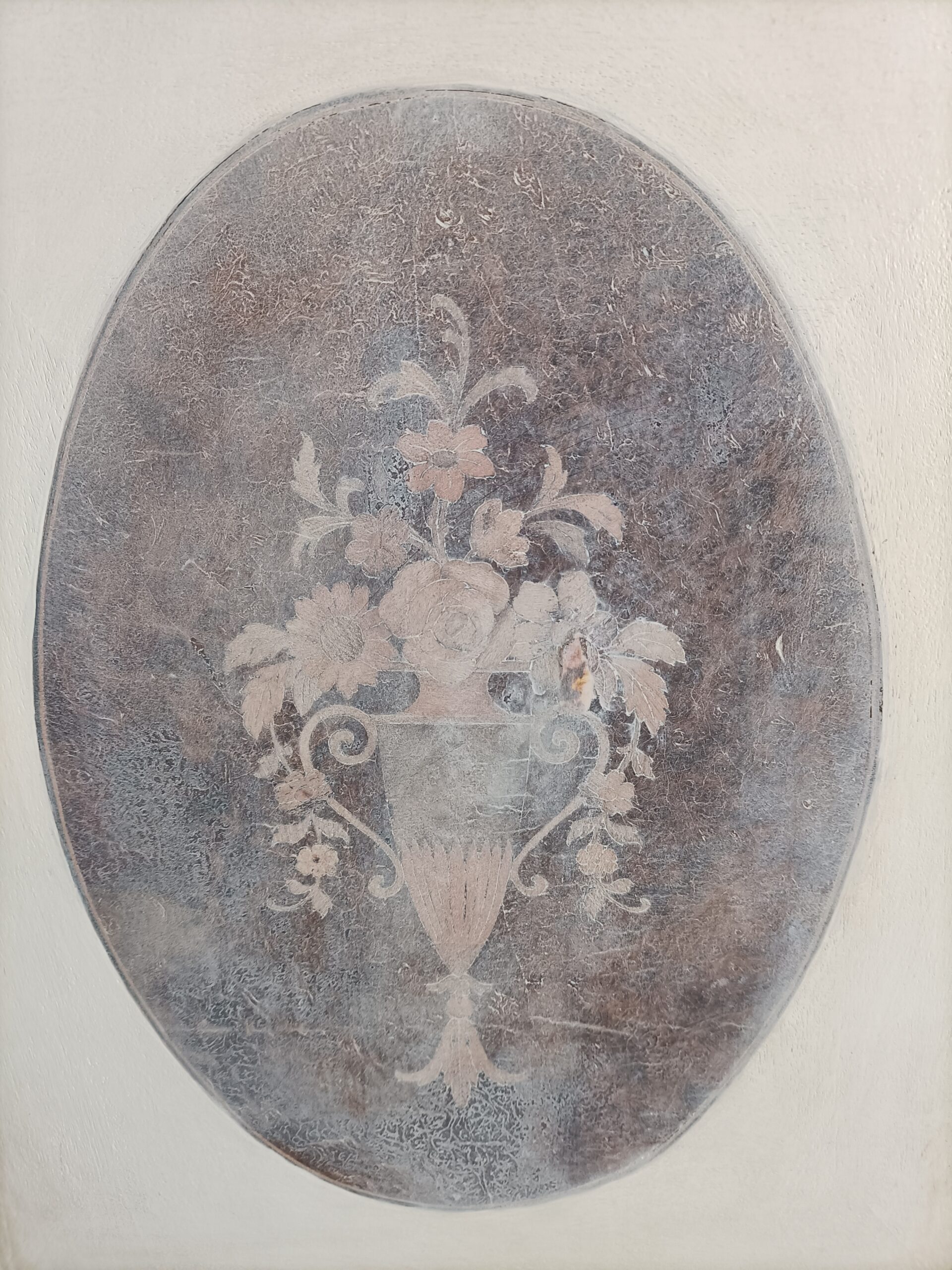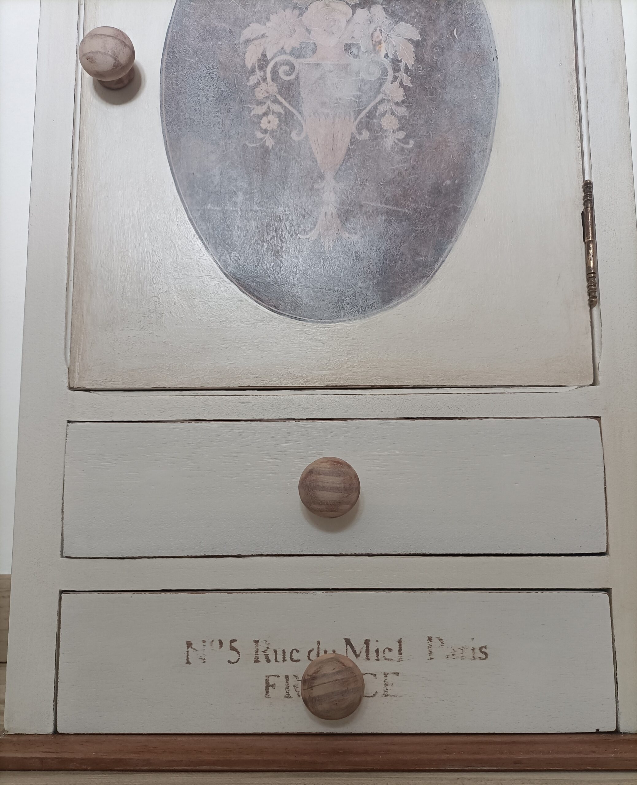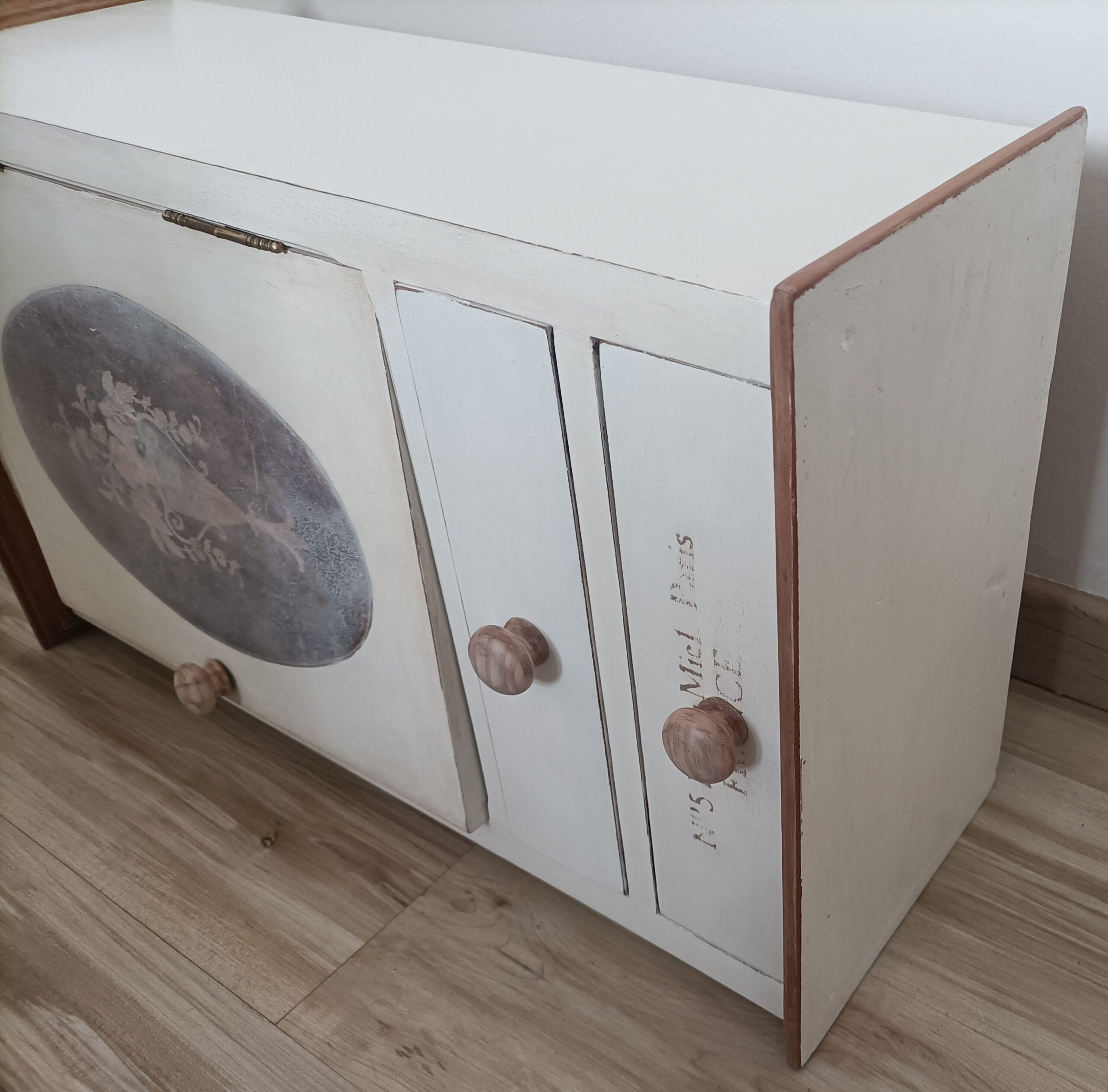 De style campagnard robuste, sa couleur blanche vieillit volontairement par son tanin puis cérusé marron lui donne un coté plus rustique. Nous avons laissé apparaitre son motif d’origine sur la porte qui a été légèrement blanchit, pour un effet vintage avec le plateau en brut vernis/ciré habillé d’un pochoir blanc.