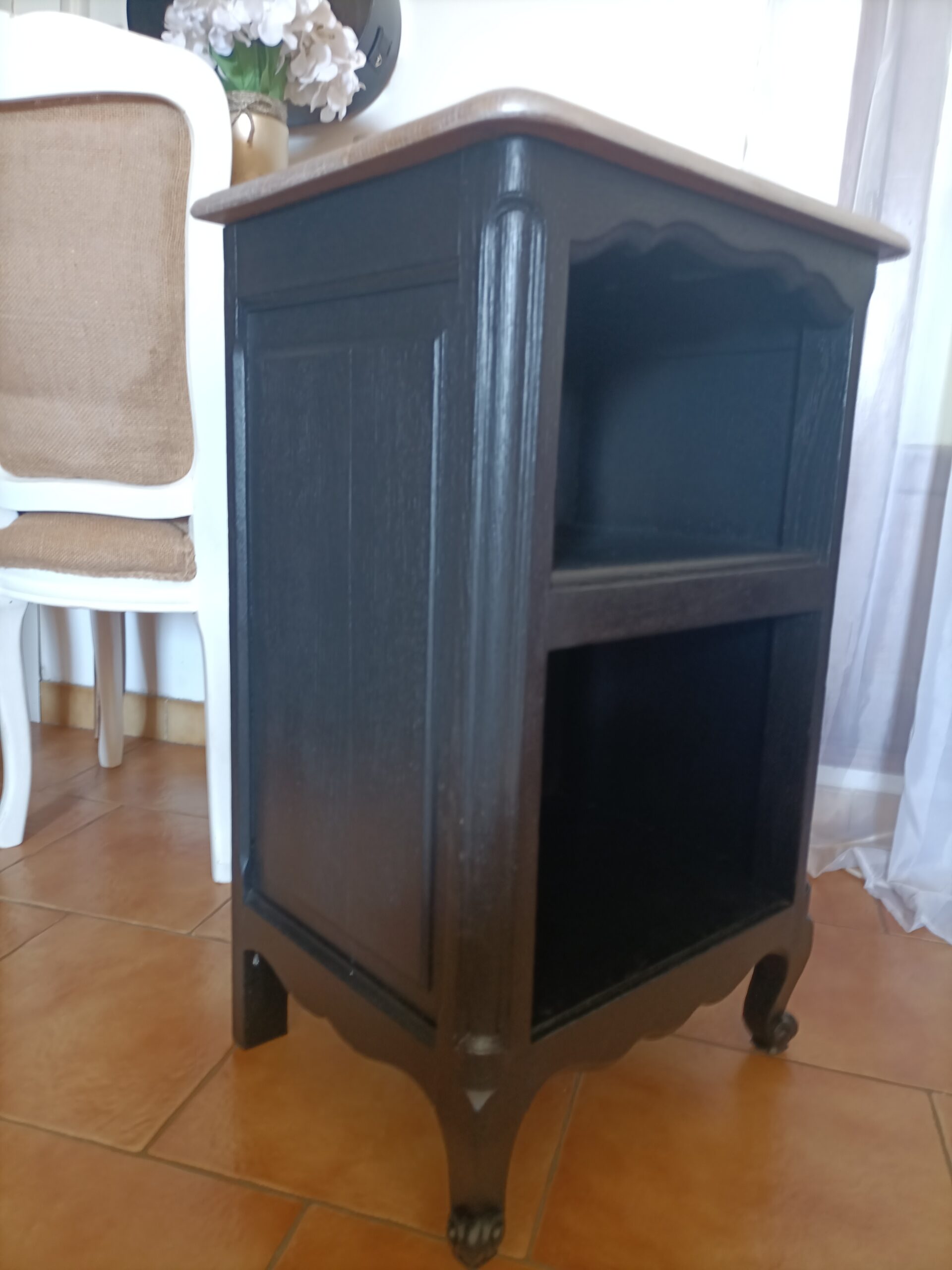 Ce meuble en bois semi massif chêne, travaillé avec soin, combine modernité et chaleur naturelle. Sa structure noire cirée à la main lui confère un style affirmé, tandis que le plateau en bois verni, dans sa teinte naturelle, adoucit l’ensemble pour un rendu harmonieux.