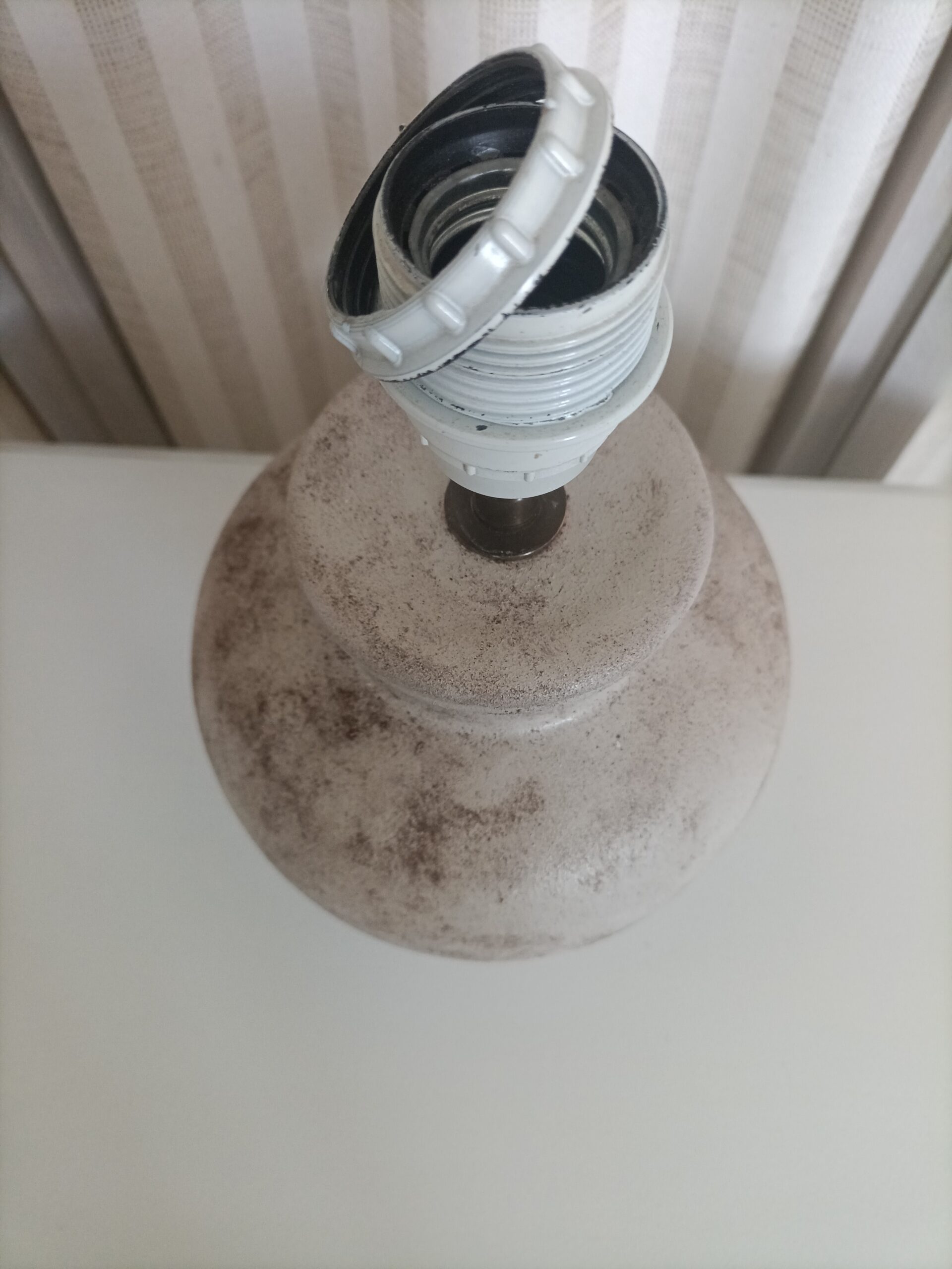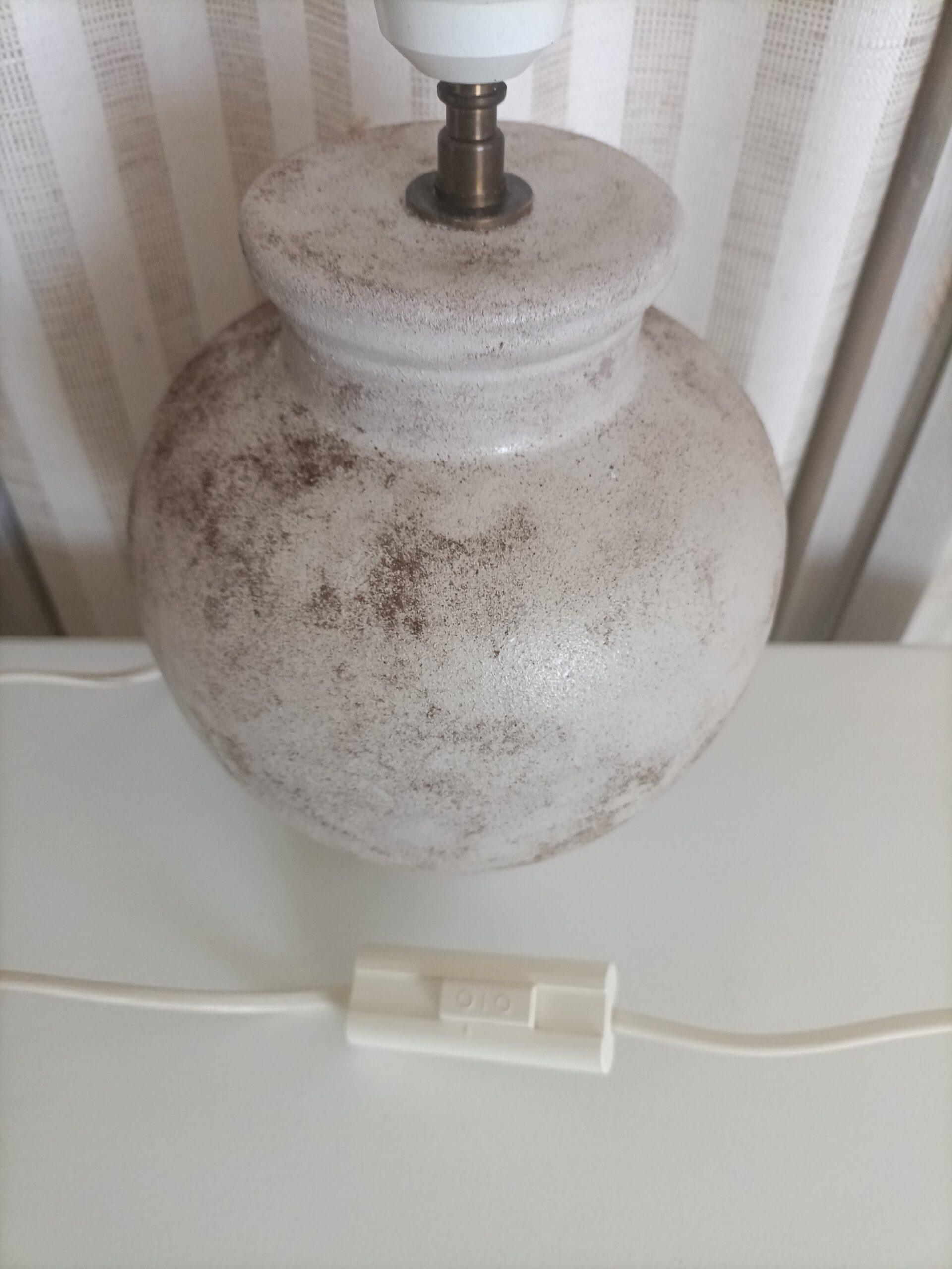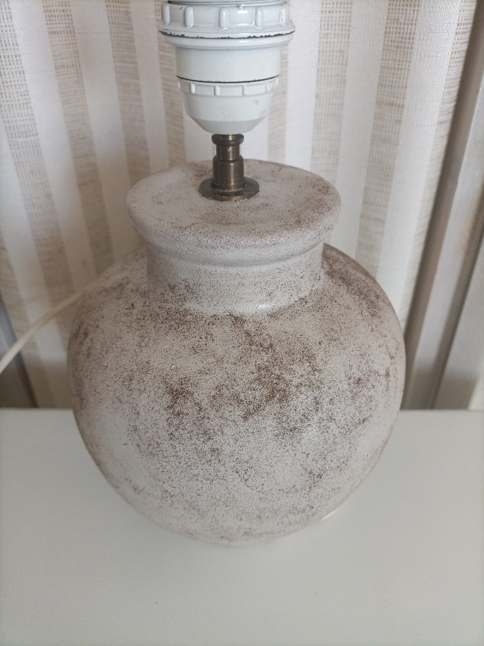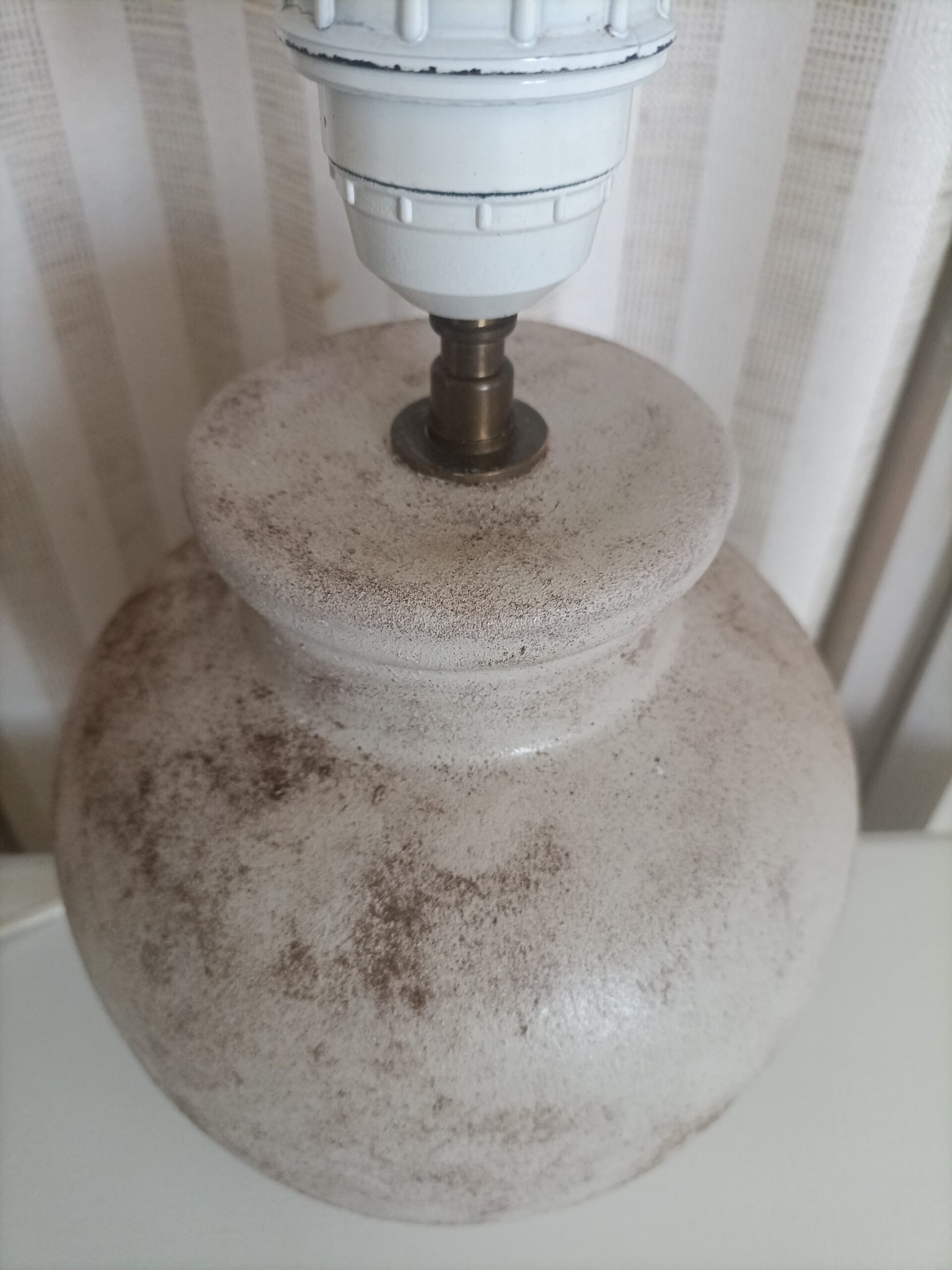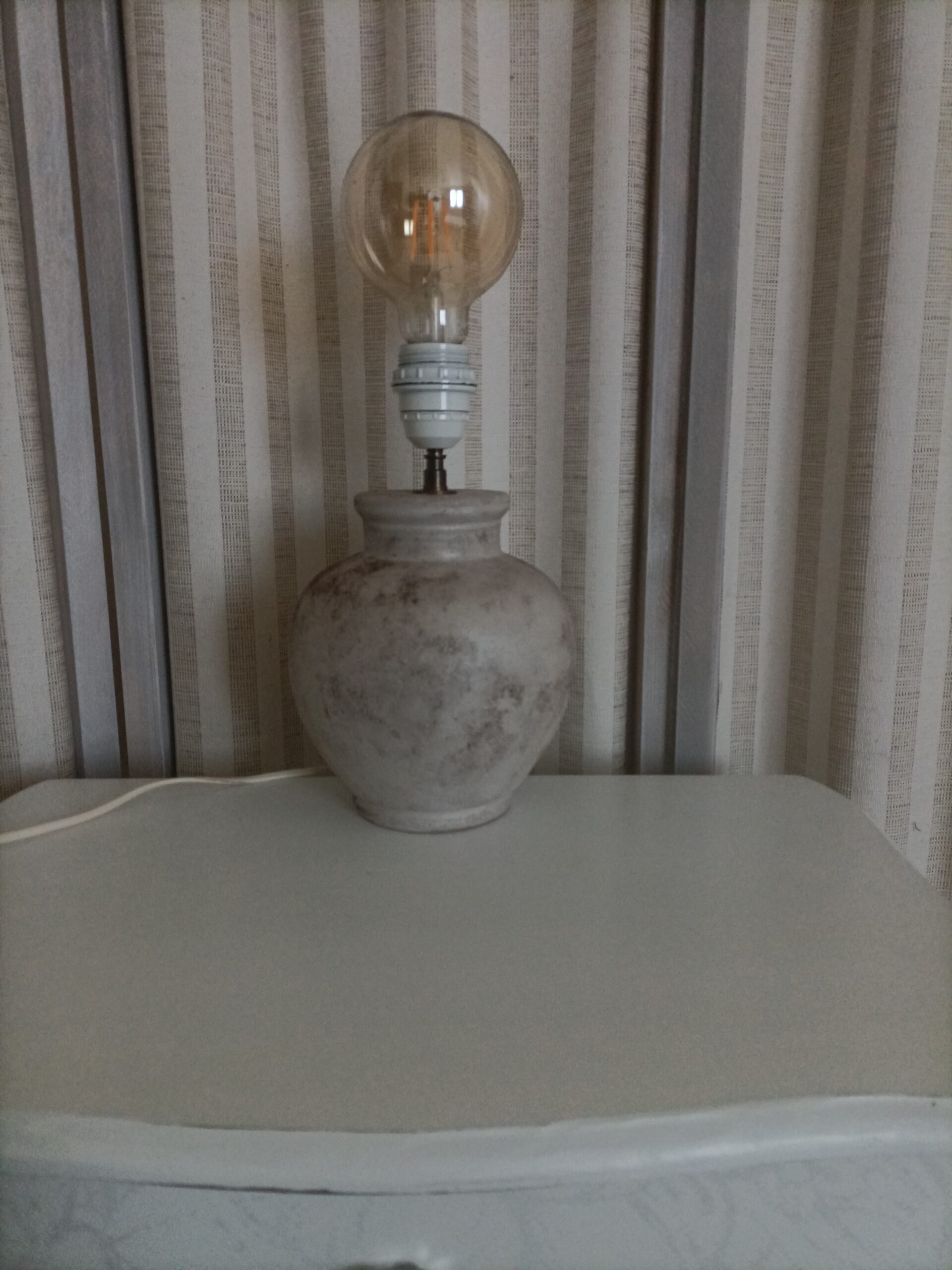 Lampe à poser en céramique relookée pour lui redonner un nouveau style de caractère. Nous l’avons totalement recouvert repeint en gris/taupe, (mélange maison), puis saupoudré d’épice pour obtenir ce rendu Shabby Chic et Vintage.