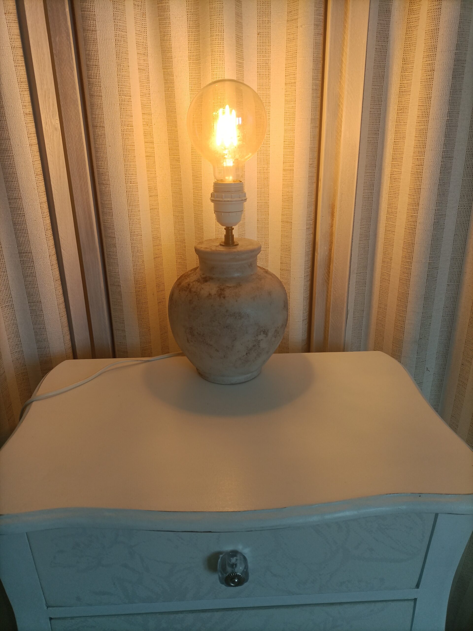 Cette magnifique lampe personnalisée se marie très bien dans un intérieur Shabby Chic et Vintage en apportant un coté rustique et doux. La lampe peut se suffire d’une belle ampoule moderne type E27 pour garder sa couleur en valeur.