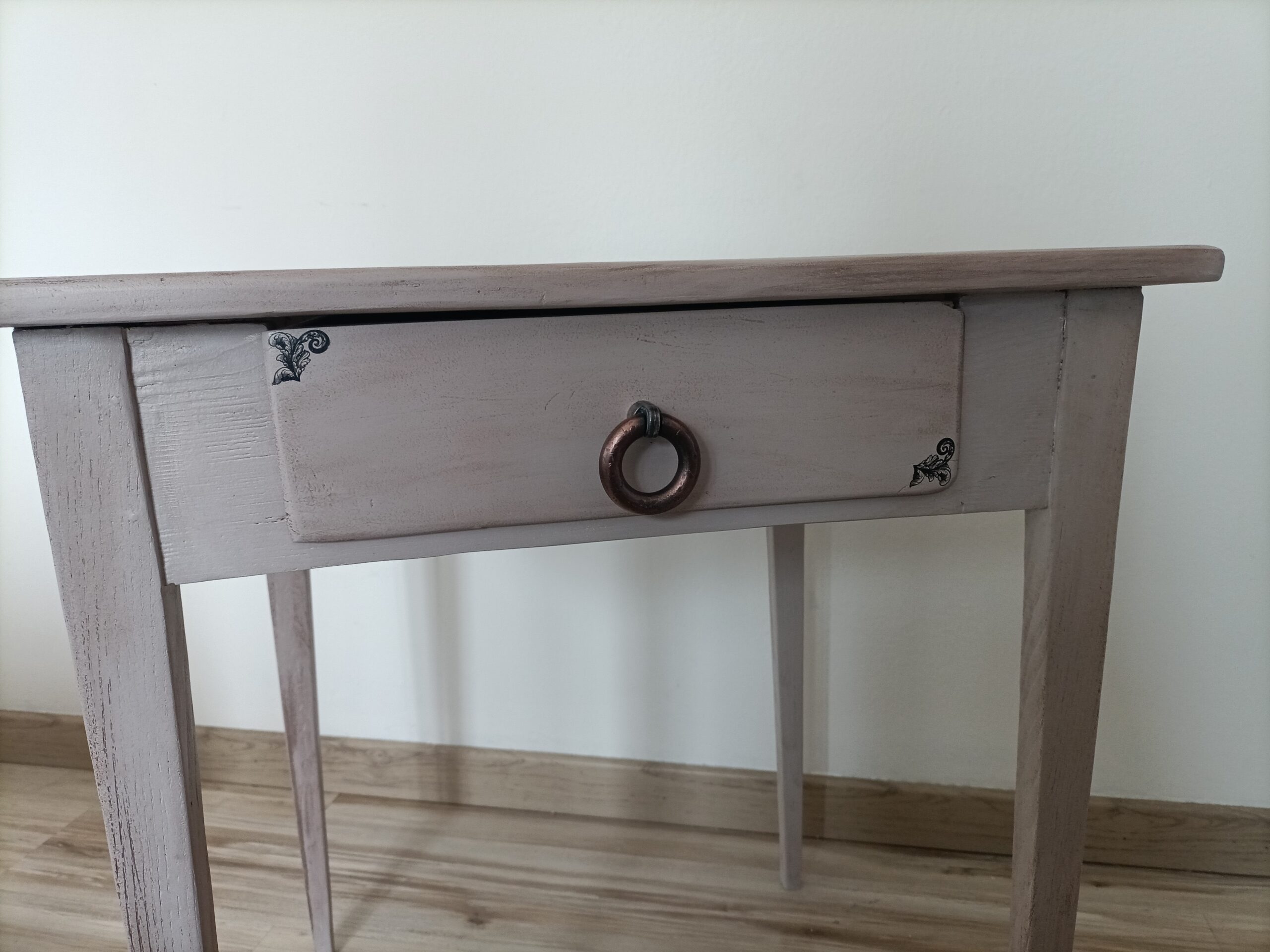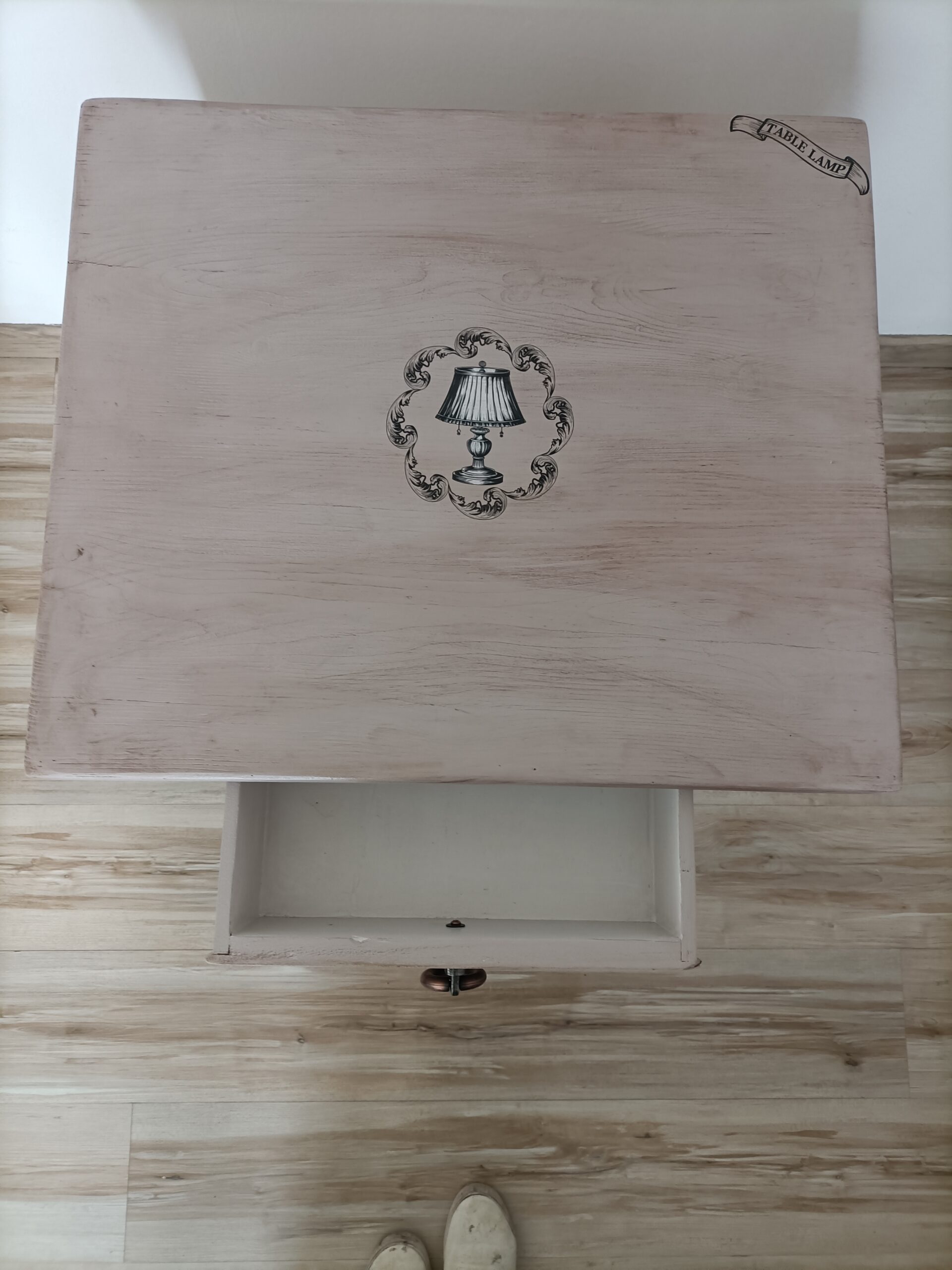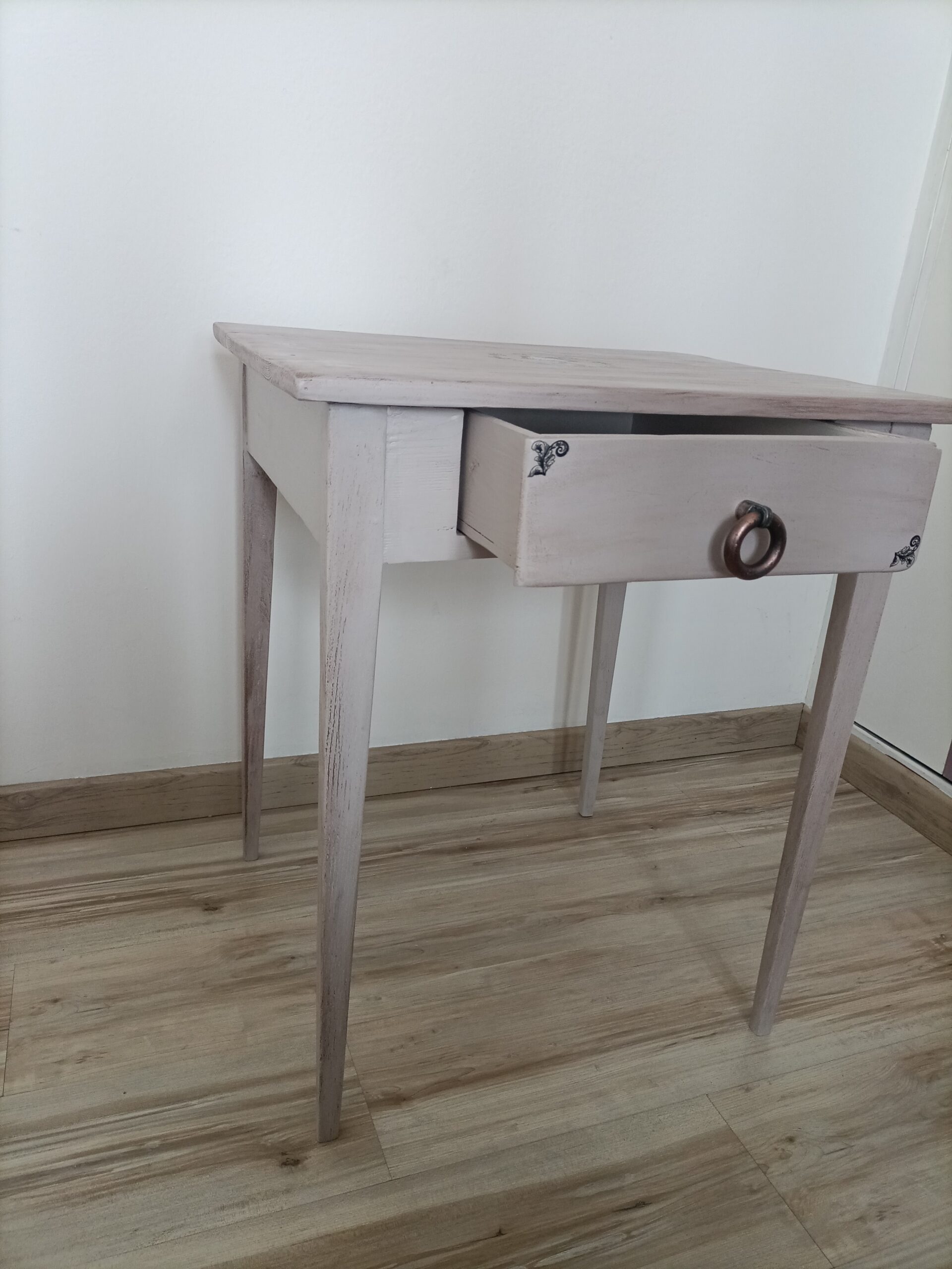 Nous avons prit plaisir de lui redonner un nouveau style couleur taupe, cérusé brun avec un pochoir vintage, après l’avoir décapée, poncée et rénovée. Un anneau en acier de couleur laiton sur le tiroir à prit la place de son ancien bouton pour lui donner du caractère.