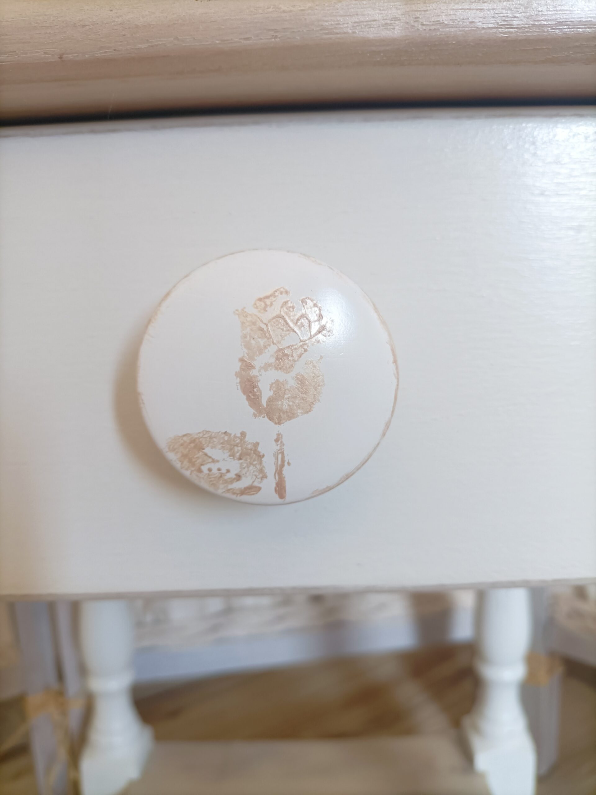 Tiroir fonctionnel avec bouton décoré à la main d’une jolie petite rose et sa feuille.