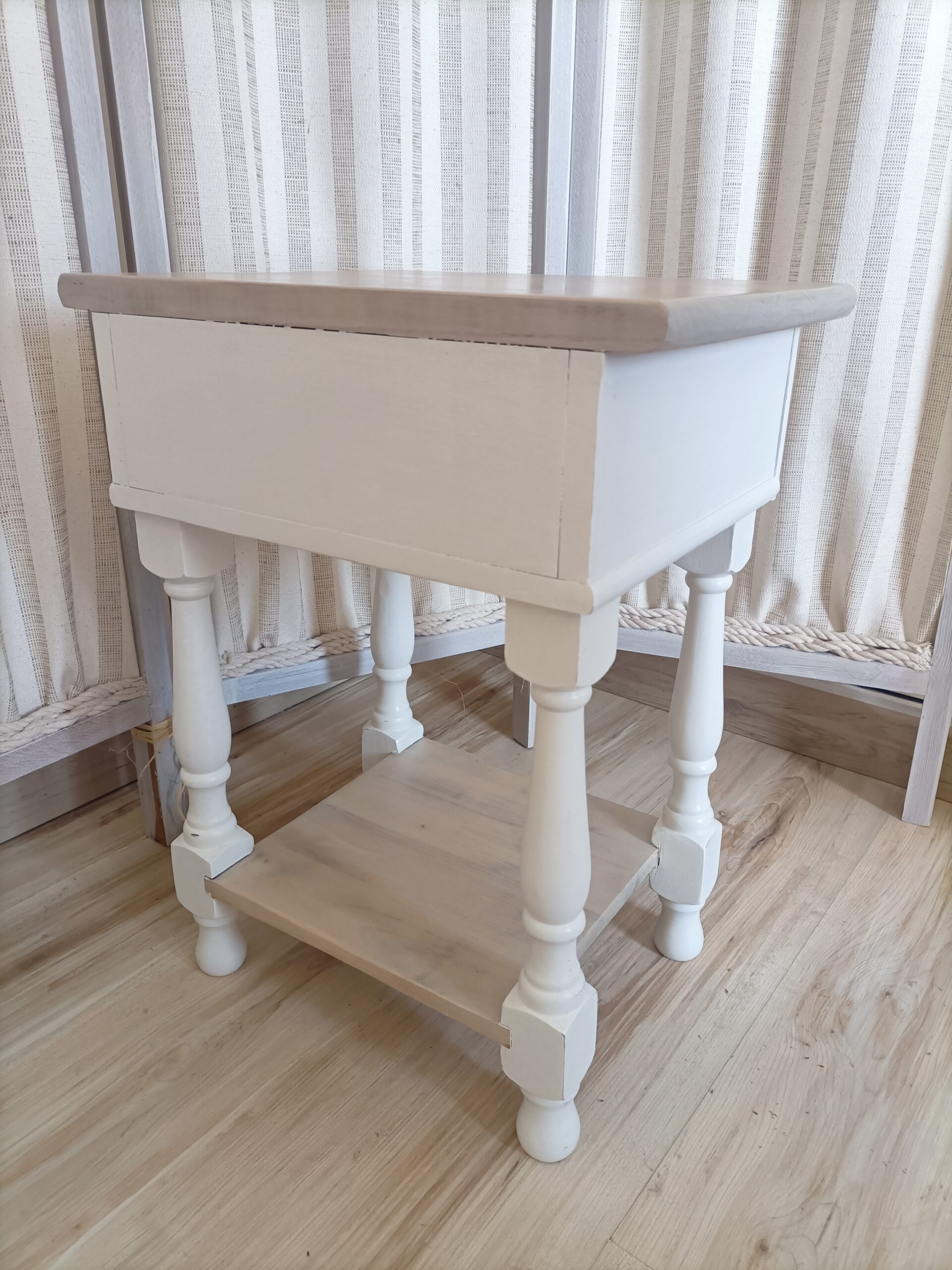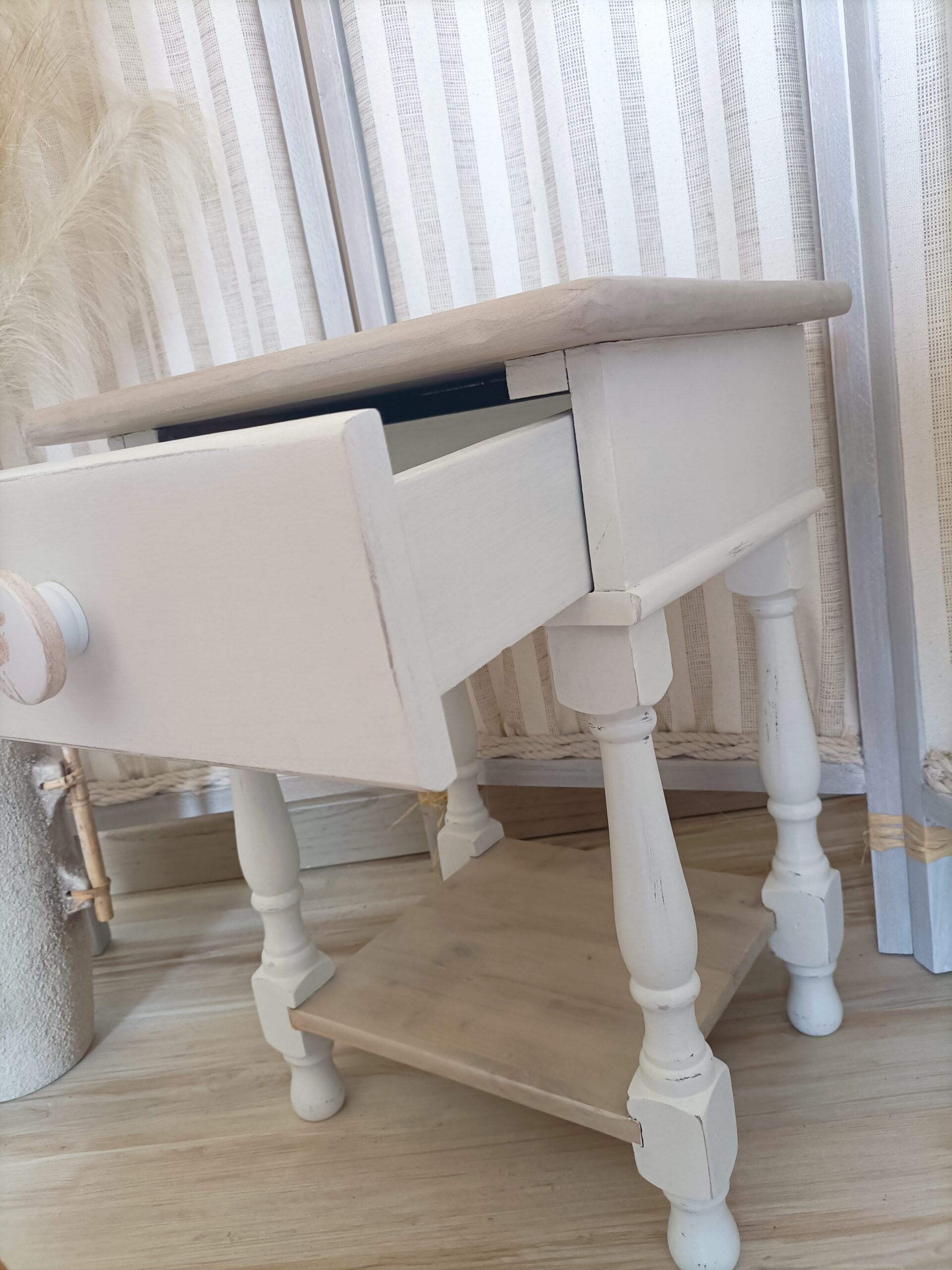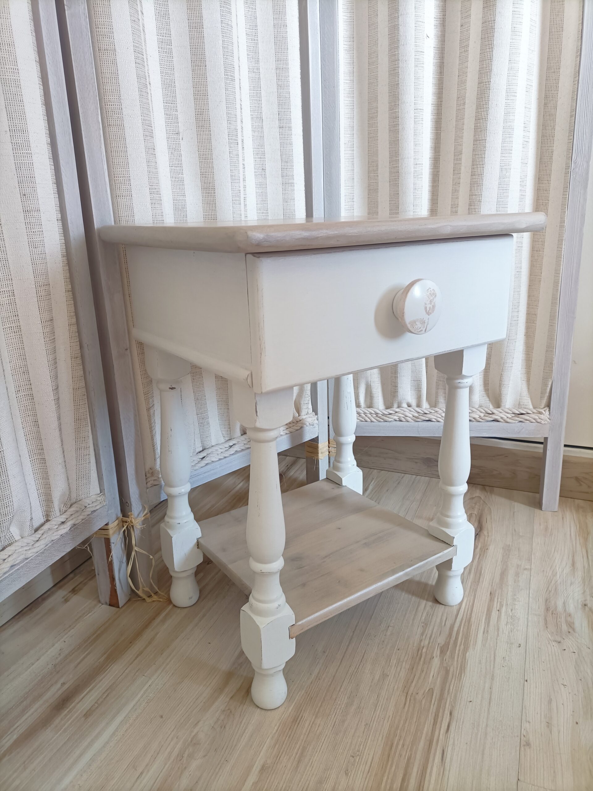 Table de chevet relookée style Shabby Chic – Bois clair & blanc – Réf M250018