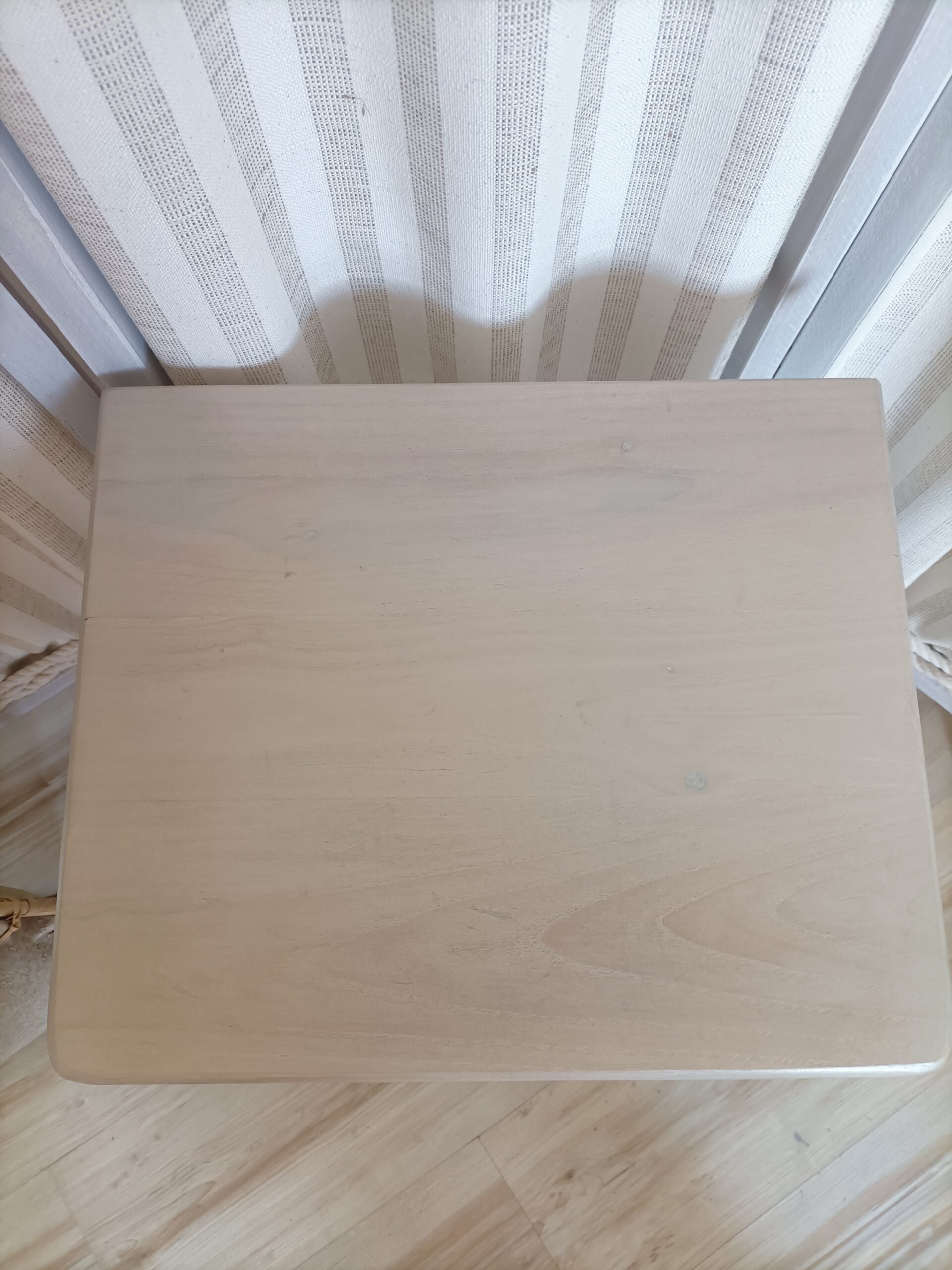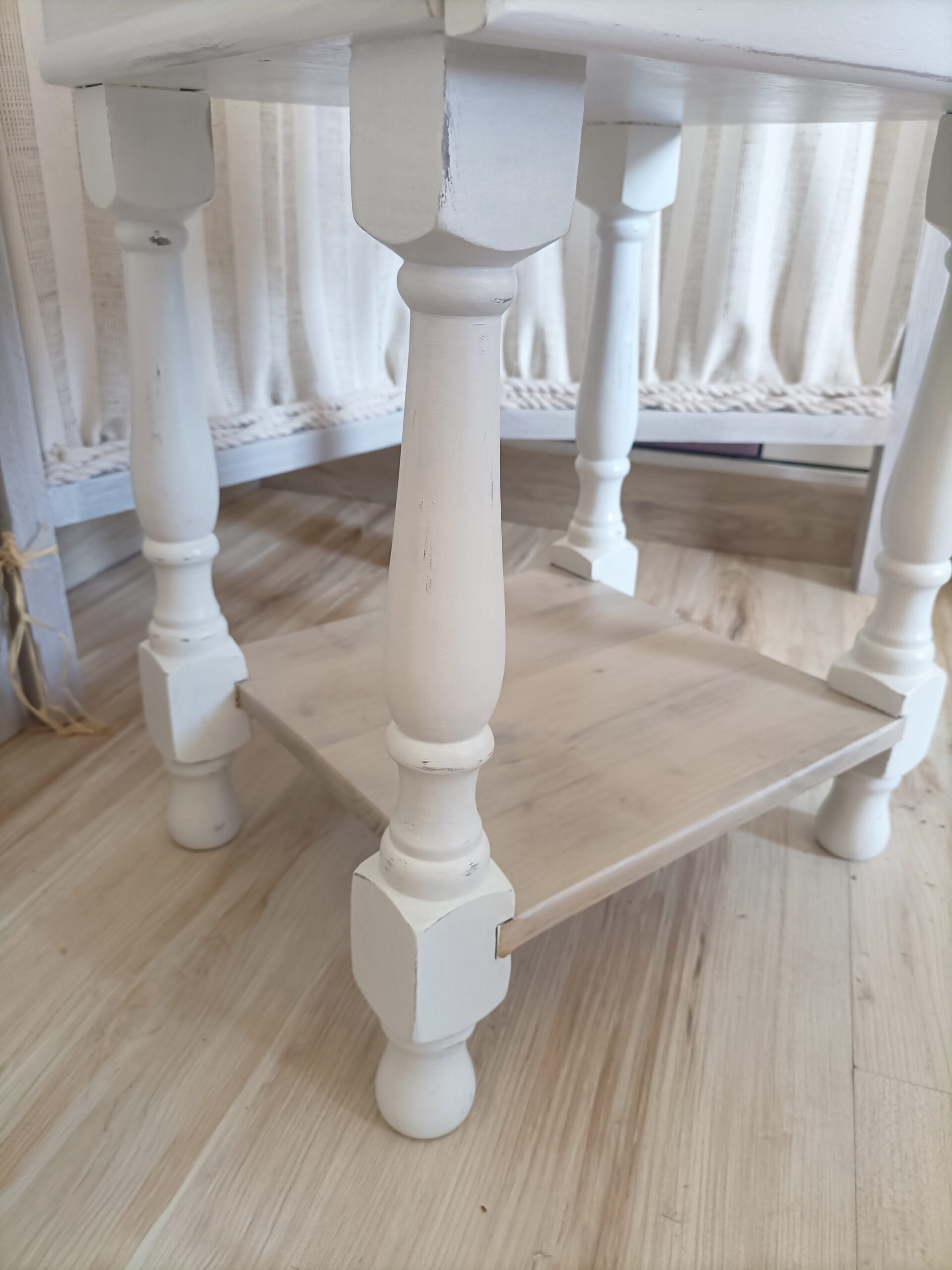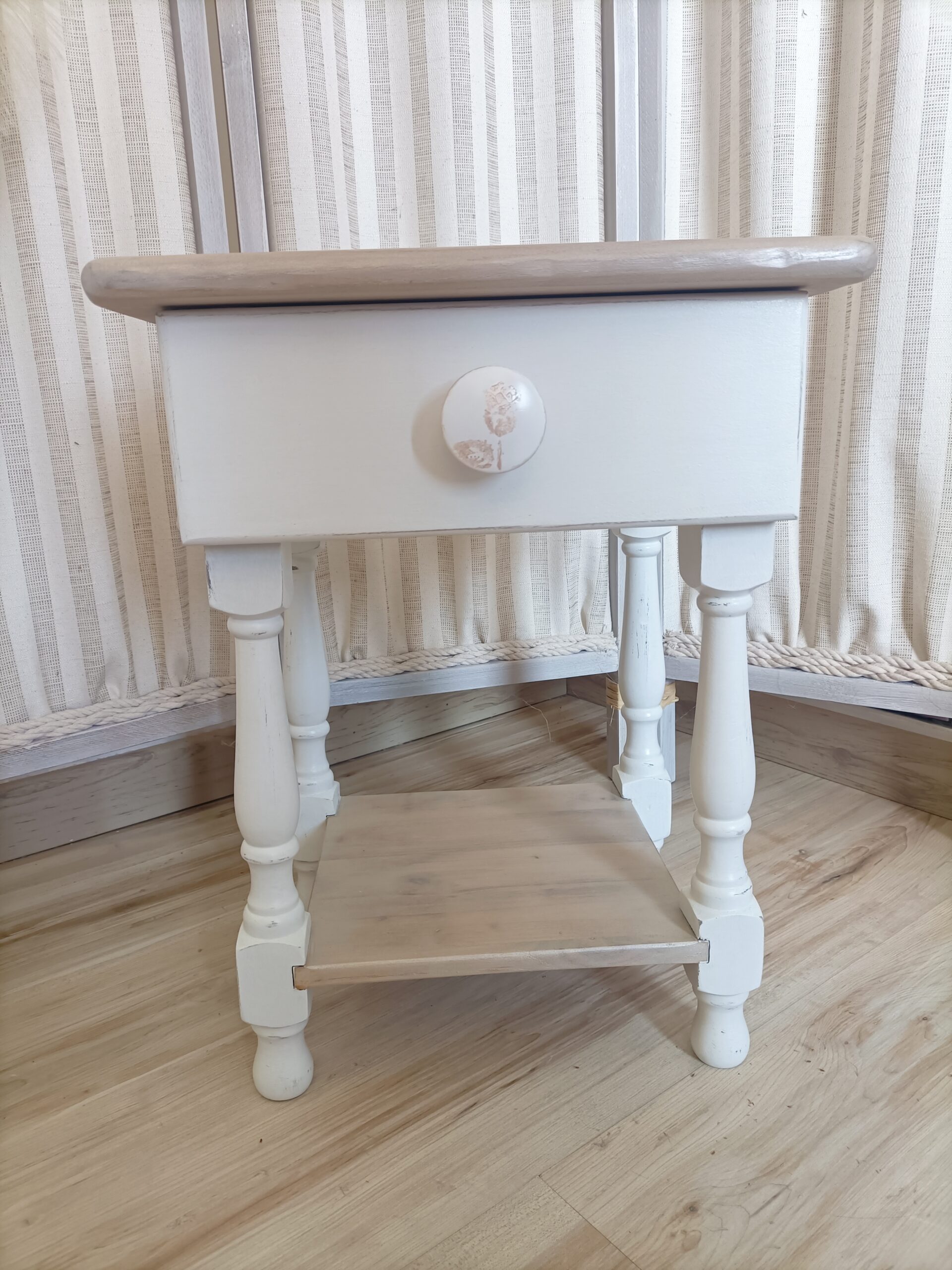 Table de chevet relookée style Shabby Chic – Bois clair & blanc – Réf M250018