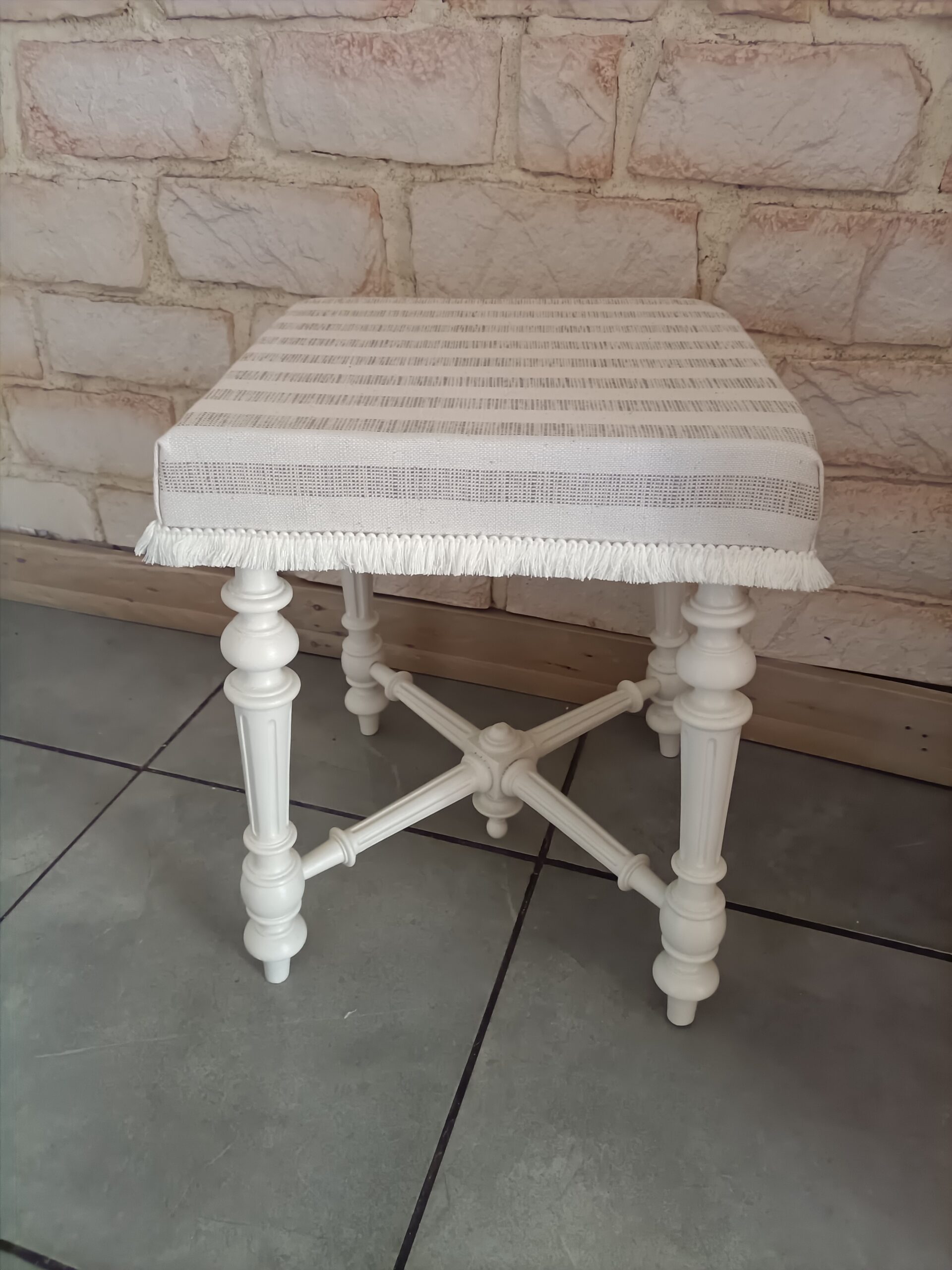 Le tabouret pour coiffeuse : Pieds tournés relookés à la même peinture que le mémo (couleur parchemin), finition d’un vernis de protection. L’assise à été totalement refaite avec de gros tasseaux pour le cadre, puis une mousse recouverte du film de coton suivi d’un tissus couleur lin à rayures assorti au Mémo pour un confort optimal, bordure à franges blanc cassé.