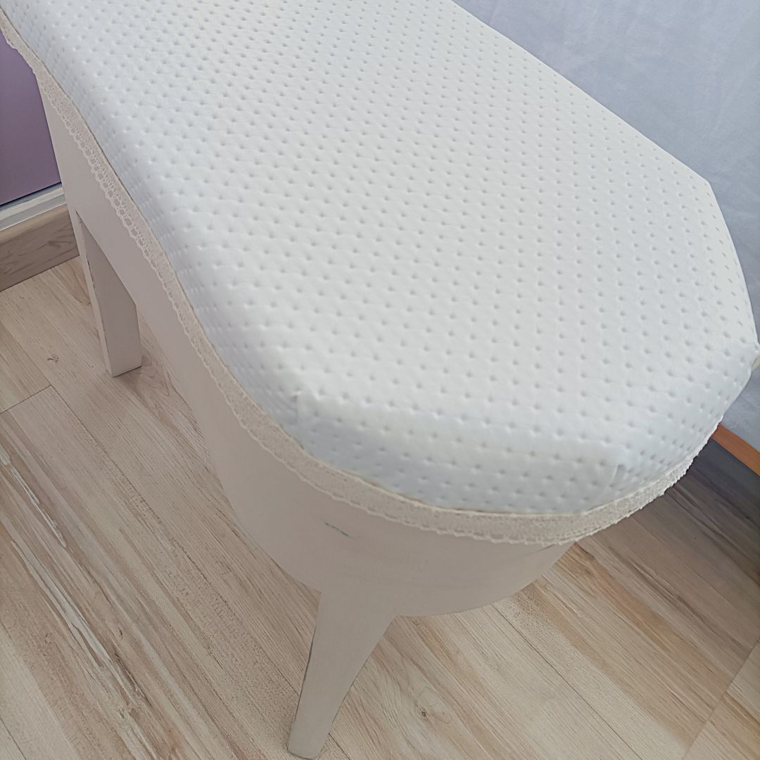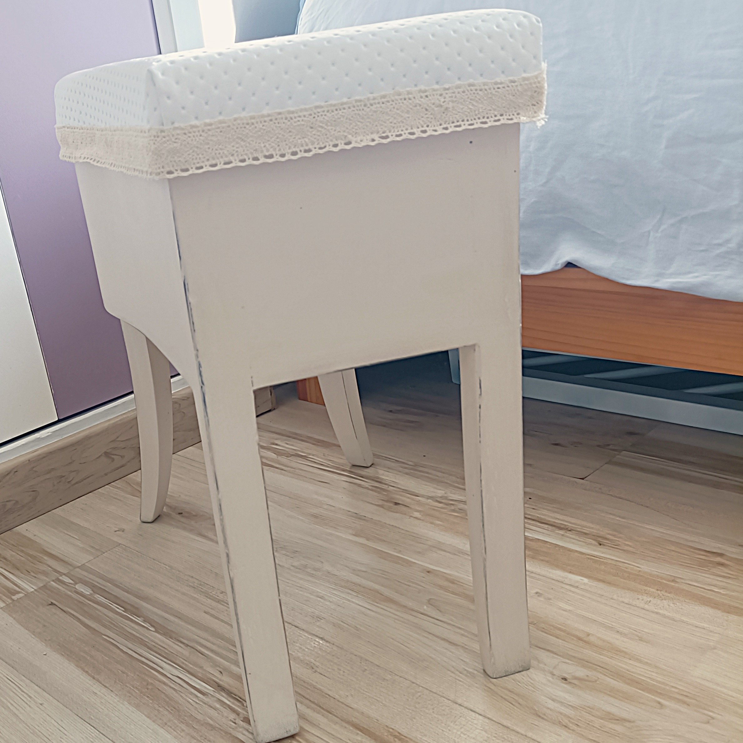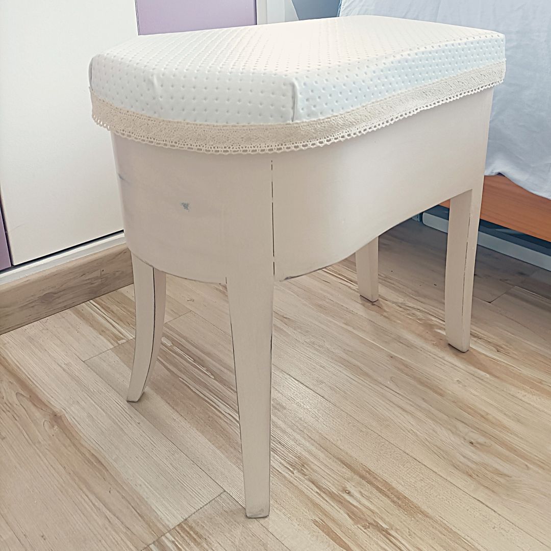 Son assise, une mousse de 3 cm, recouverte d’un simili cuir blanc agrémenté de poinçons régulier, décoré d’un galon en dentelle pour sa finition. Il a été totalement peint en 3 couches couleur parchemin et vernis pour le rendre Unique dans son genre. Son dessus, maintenant l’assise, donne l’accès à un vaste rangement.