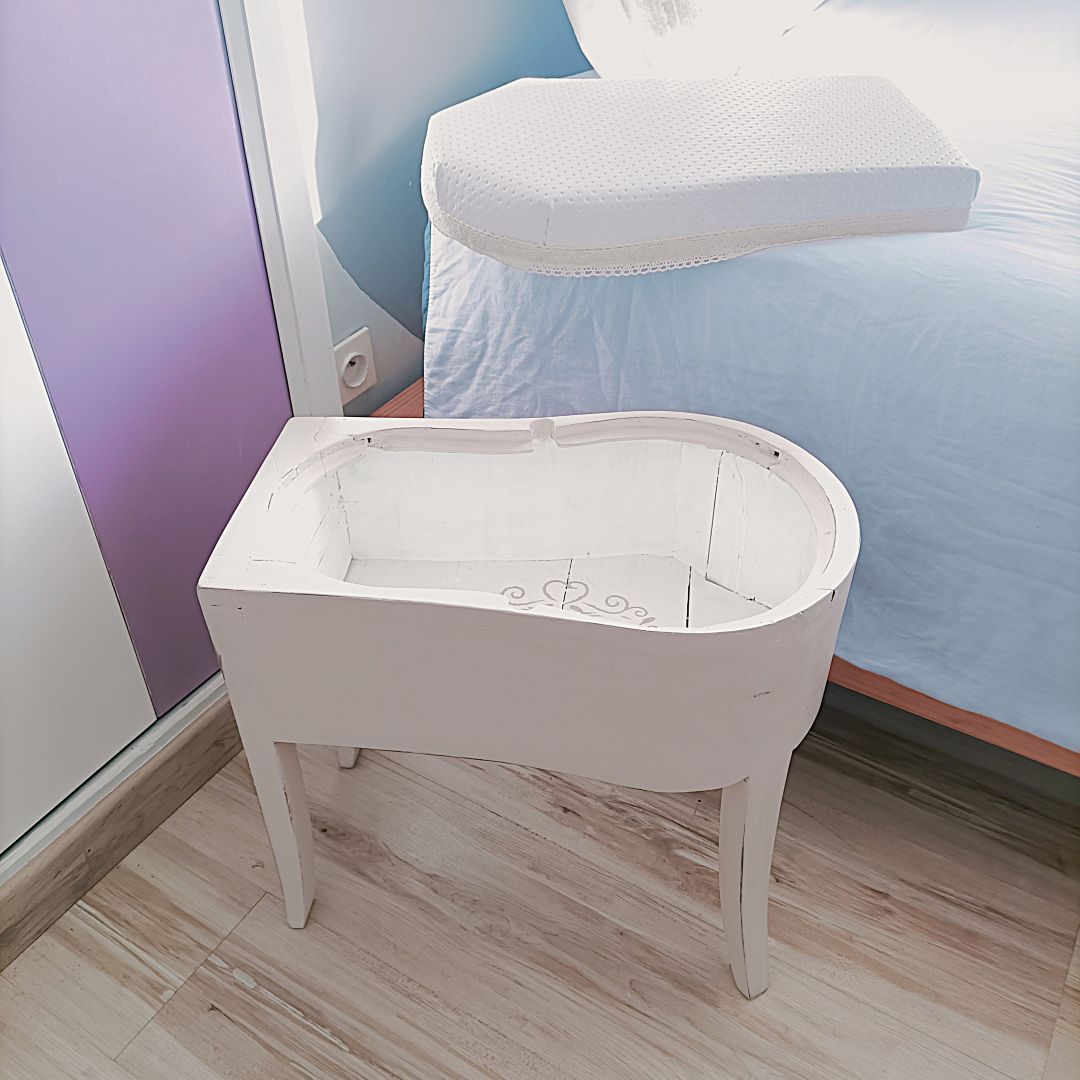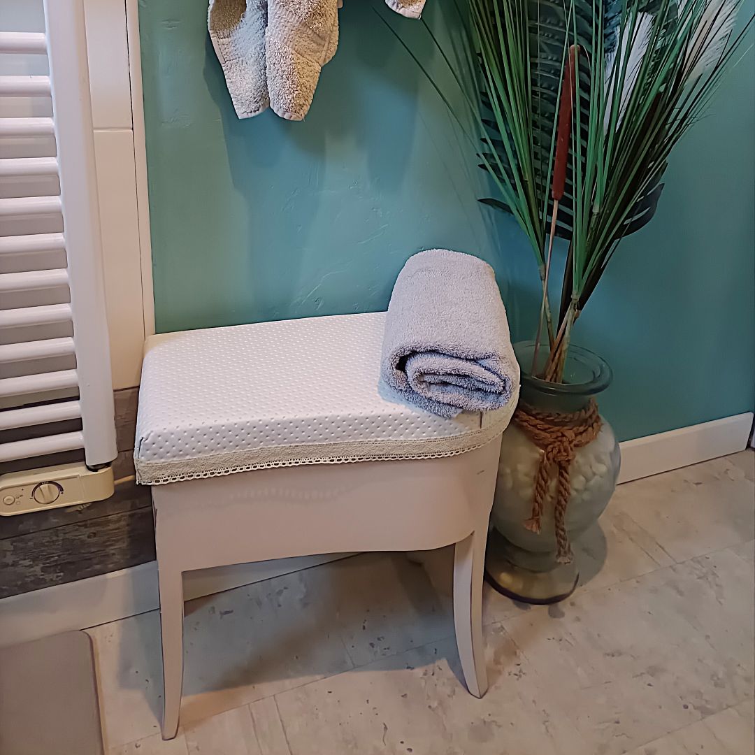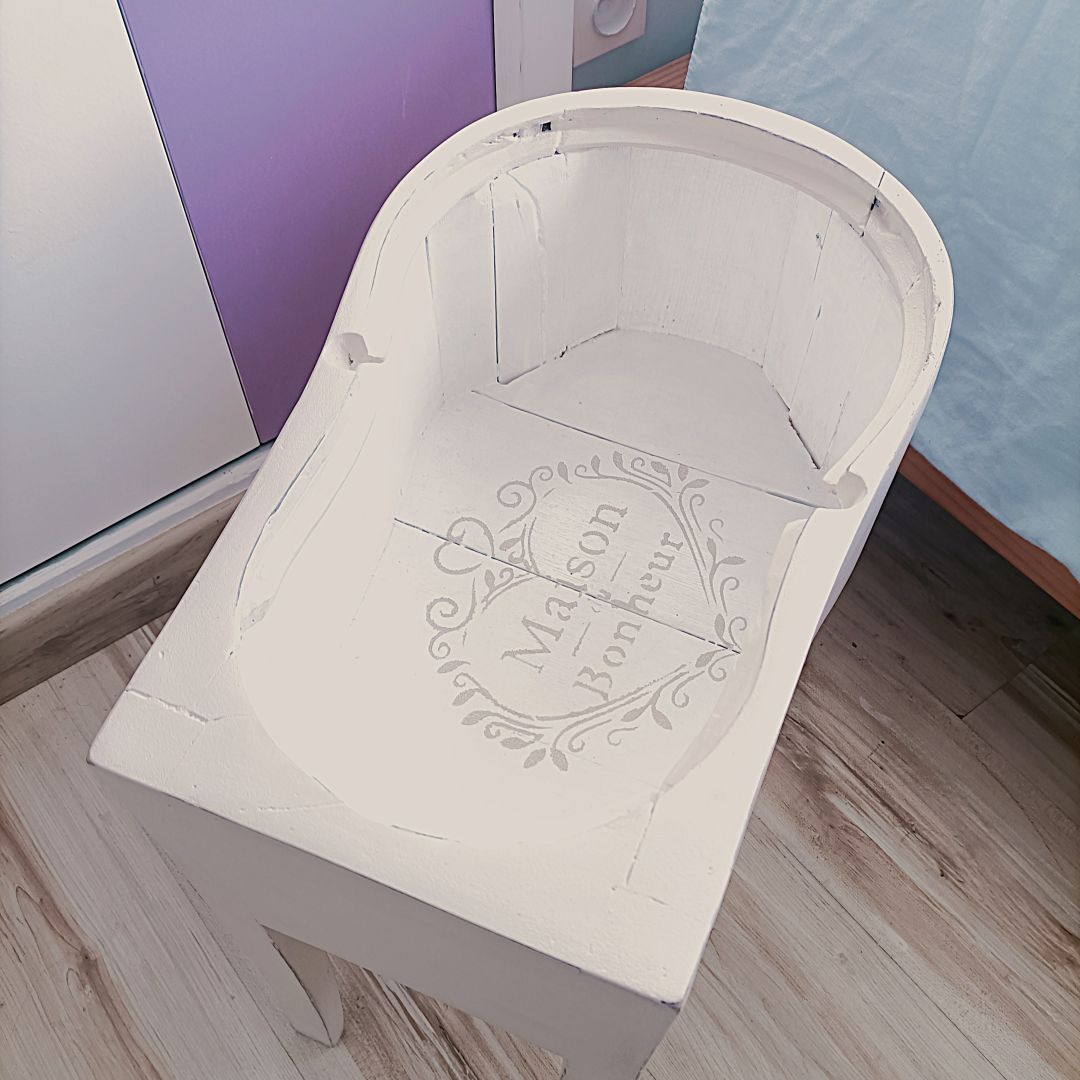 Son assise, une mousse de 3 cm, recouverte d’un simili cuir blanc agrémenté de poinçons régulier, décoré d’un galon en dentelle pour sa finition. Il a été totalement peint en 3 couches couleur parchemin et vernis pour le rendre Unique dans son genre. Son dessus, maintenant l’assise, donne l’accès à un vaste rangement.